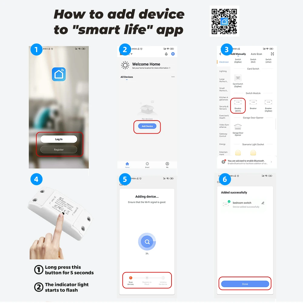 4. Si le voyant de l’interrupteur intelligent ne clignote pas rouge, s’il vous plaît appuyez sur le bouton de l’interrupteur intelligent et gardez-le pendant plus de 5 secondes jusqu’à ce que le voyant rouge clignote en continu, puis ouvrez l’application et connectez-vous au WiFi selon le manuel.