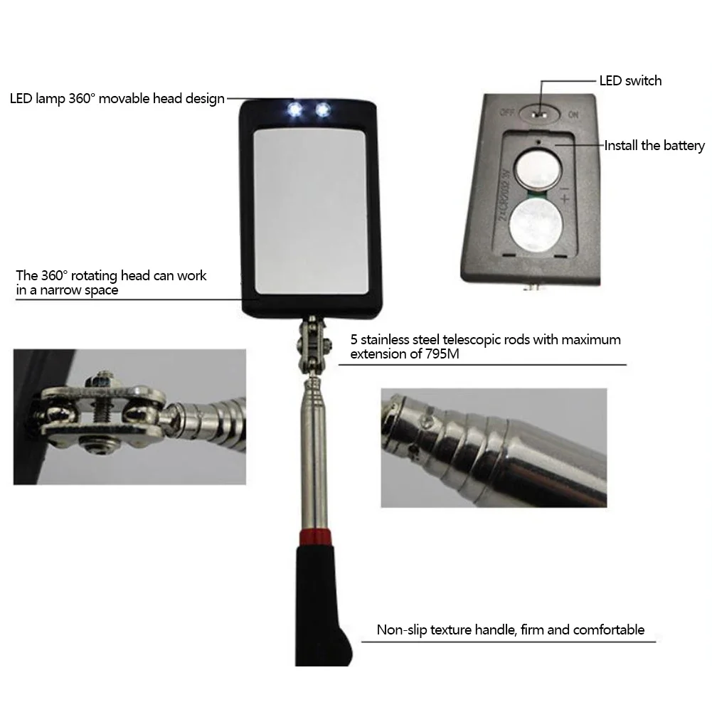 Il présente également une rotule rotative à 360 degrés pour des capacités de visualisation supplémentaires, permettant un miroir d’inspection pour pivoter librement, mais contenant une position souhaitée.