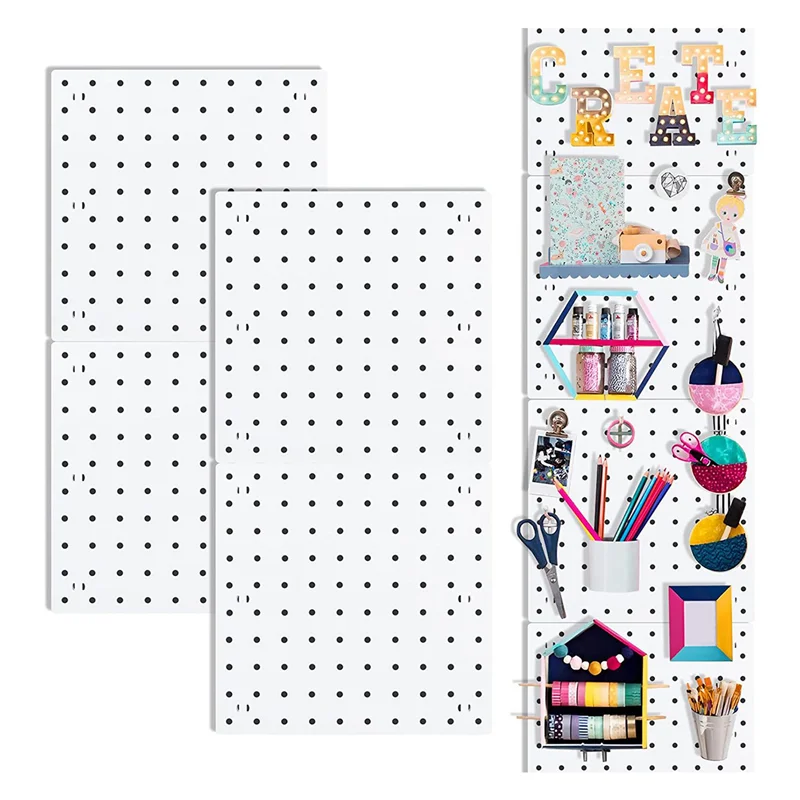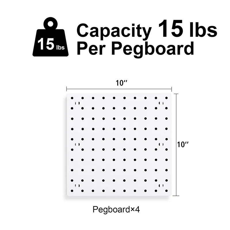 Spécifications des panneaux perforés – 10 x 10 pouces par panneau perforé blanc avec des trous de 1/4 pouces (diamètre), 4 pièces peuvent être épissées ensemble pour former une zone d’affichage du panneau perforé de 20 pouces X20 pouces et 10 pouces X40 pouces.Chaque panneau perforé peut supporter environ 5 à 15 lb.Si vous souhaitez l’appliquer dans des garages, des salles d’artisanat ou d’autres endroits nécessitant des panneaux perforés de plus grande taille, vous pouvez commander quelques ensembles supplémentaires pour bricoler votre espace.
