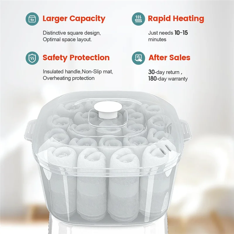 Conception peu encombrante : la structure carrée supérieure de notre cuiseur vapeur assure une utilisation optimale de l’espace.Avec une capacité de contenir jusqu’à 6 serviettes ou 12 débarbouillettes, c’est un choix parfait pour les petits espaces sans conduire à un encombrement inutile.