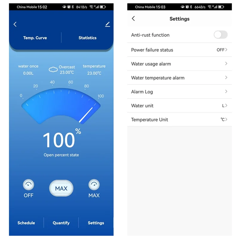 1.Ouvrez/fermez la vanne d’eau d’un angle de 0 % à 100 % via l’application mobile