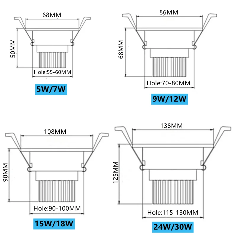 Puissance: 5W, 7W, 9W, 12W, 15W, 18W, 24W, 30W