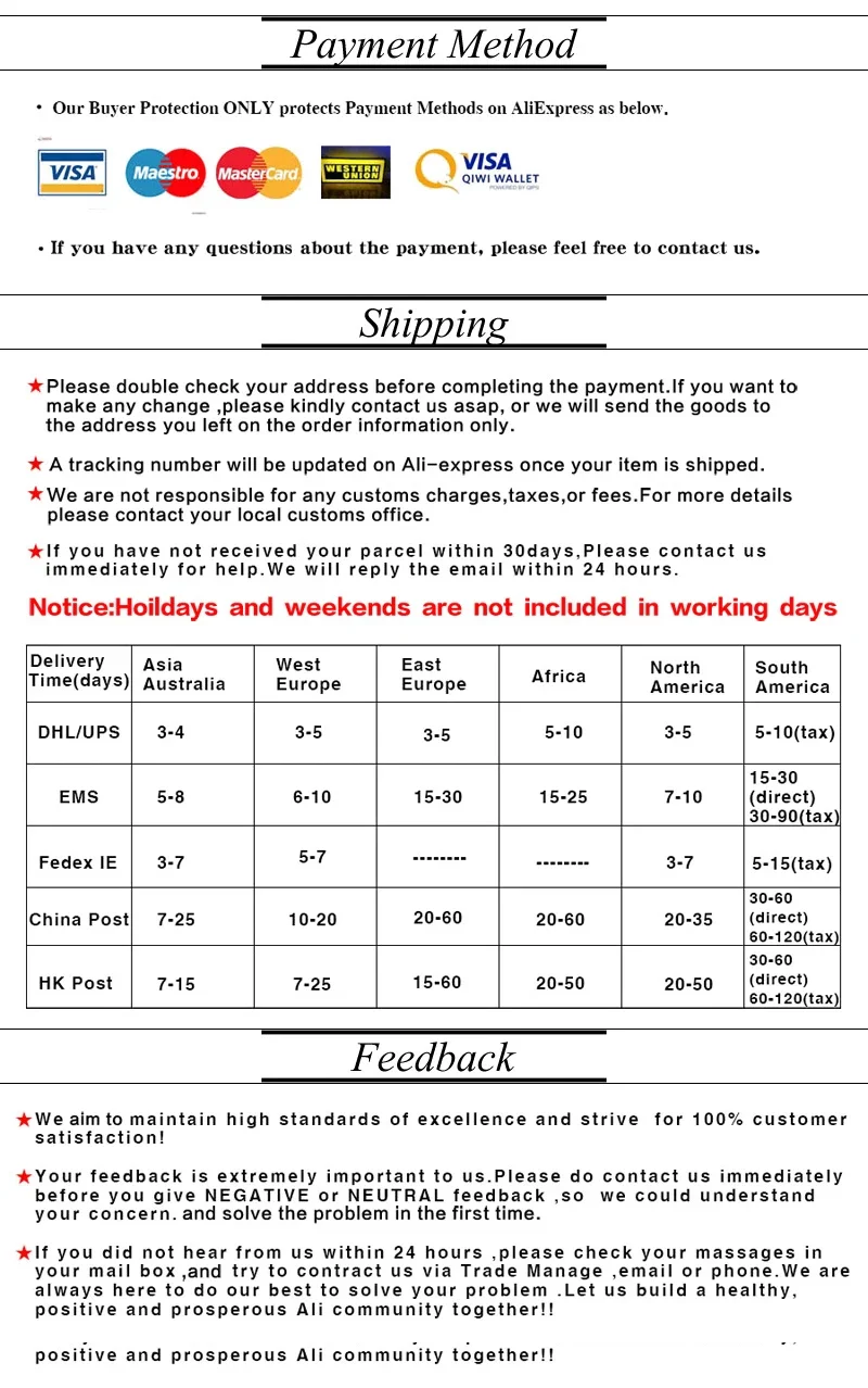 1. Si le produit n’est pas identique à la description ou cassé pendant le transport. Lorsque vous nous montrez les photos, nous vous renverrons ou vous rembourserons l’argent. 2. Pour quelque raison que ce soit, vous n’êtes pas satisfait des articles, nous acceptons les retours et les échanges dans les 7 jours suivant la réception de votre article et vous devez payer les frais d’expédition de retour. 3. Si les articles sont défectueux, veuillez nous en informer immédiatement afin qu’ils soient remplacés ou réparés. Si le remplacement n’est pas disponible, le remboursement sera émis avec le mode de paiement original.