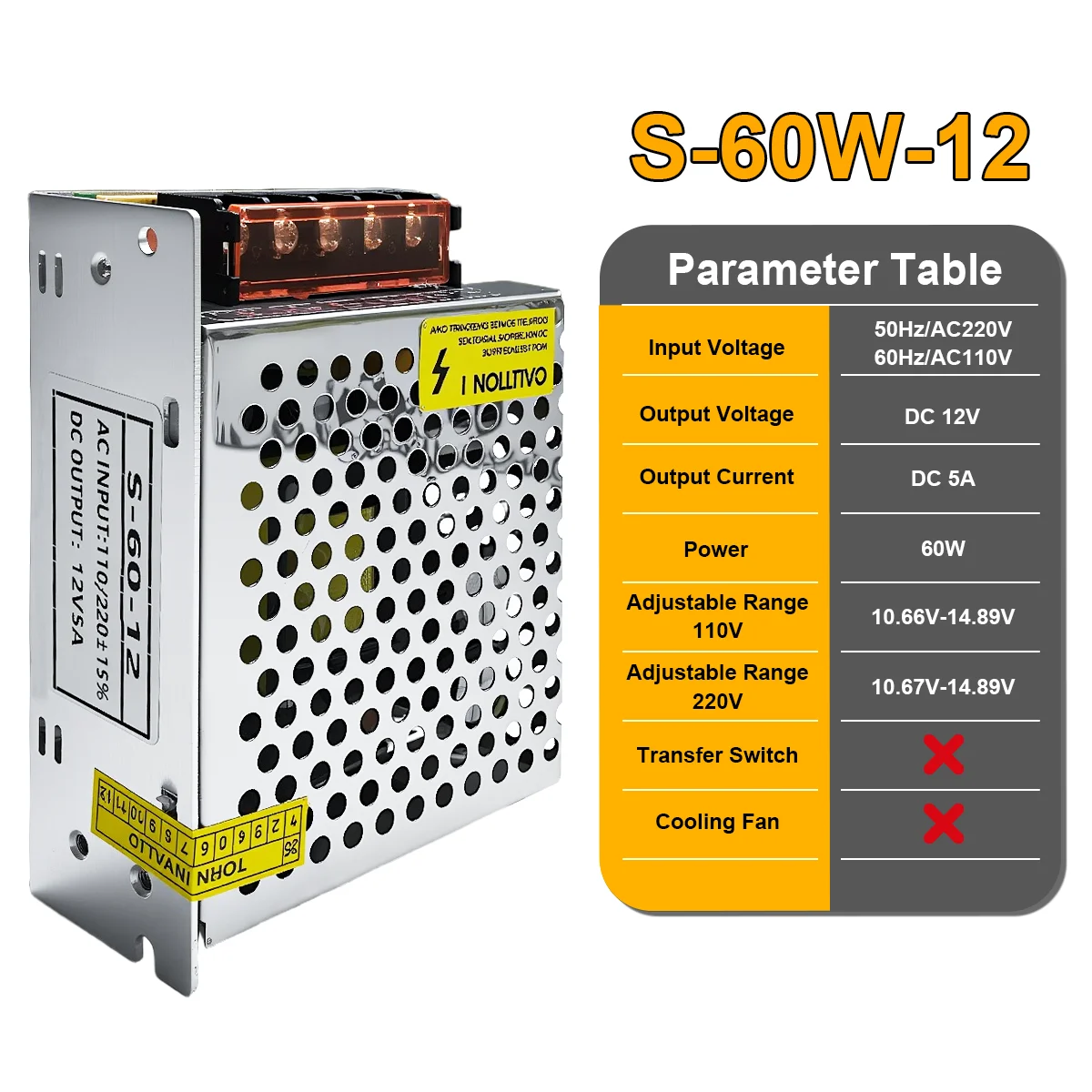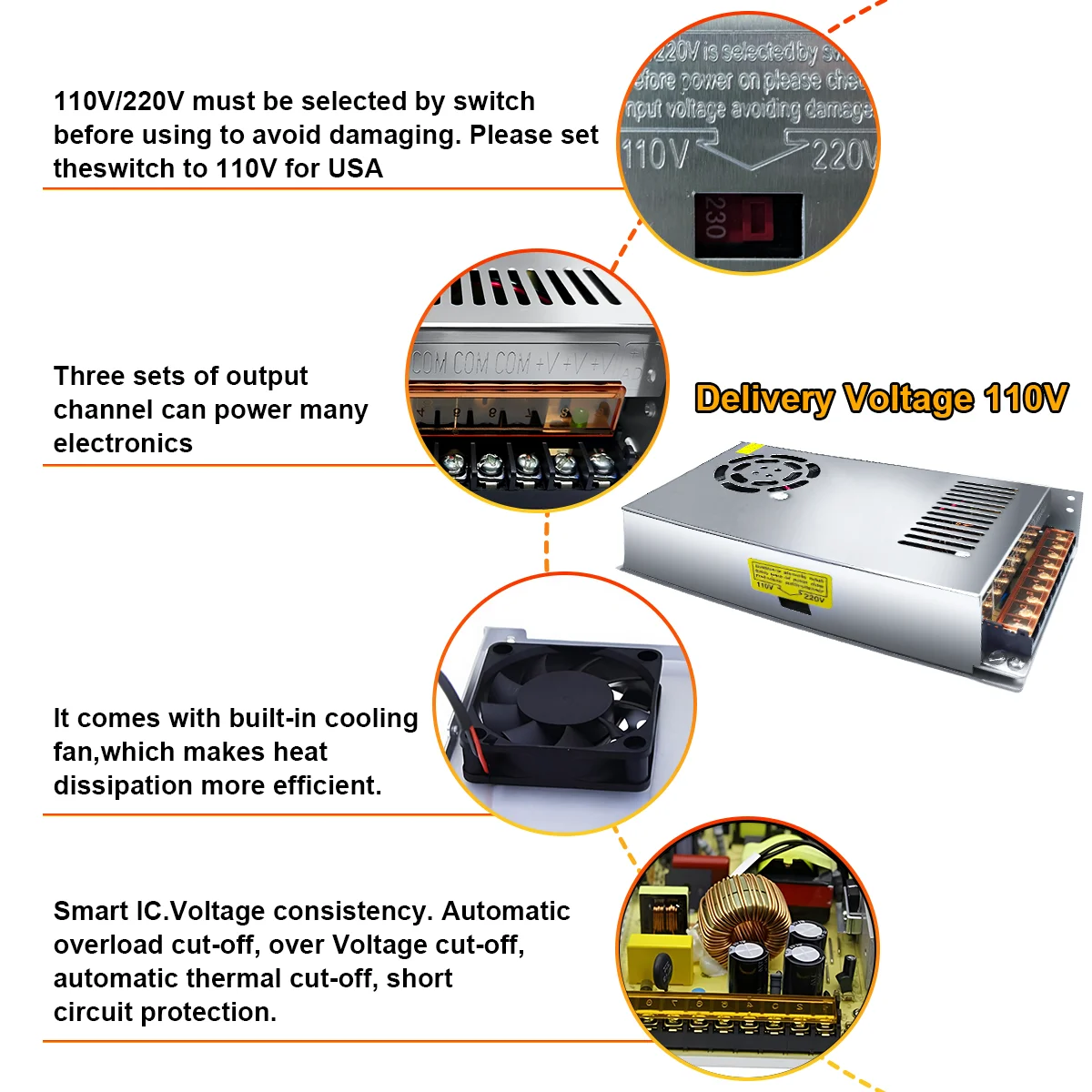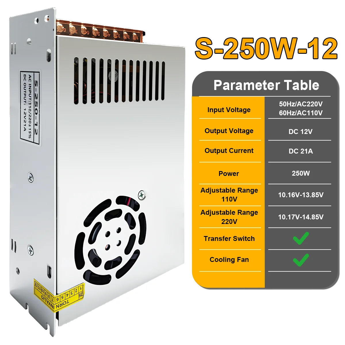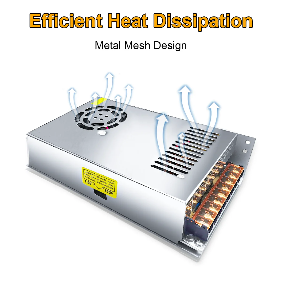 L’alimentation à interrupteur converte AC 110 V/220 V vers DC 12 V 60 W/250 W /500 W : la tension d’entrée défaut est de 110 V, la tension de sortie est réglable à 10%, un boîtier métallique avec de nombreuses trous font la dissipation thermique plus efficace.