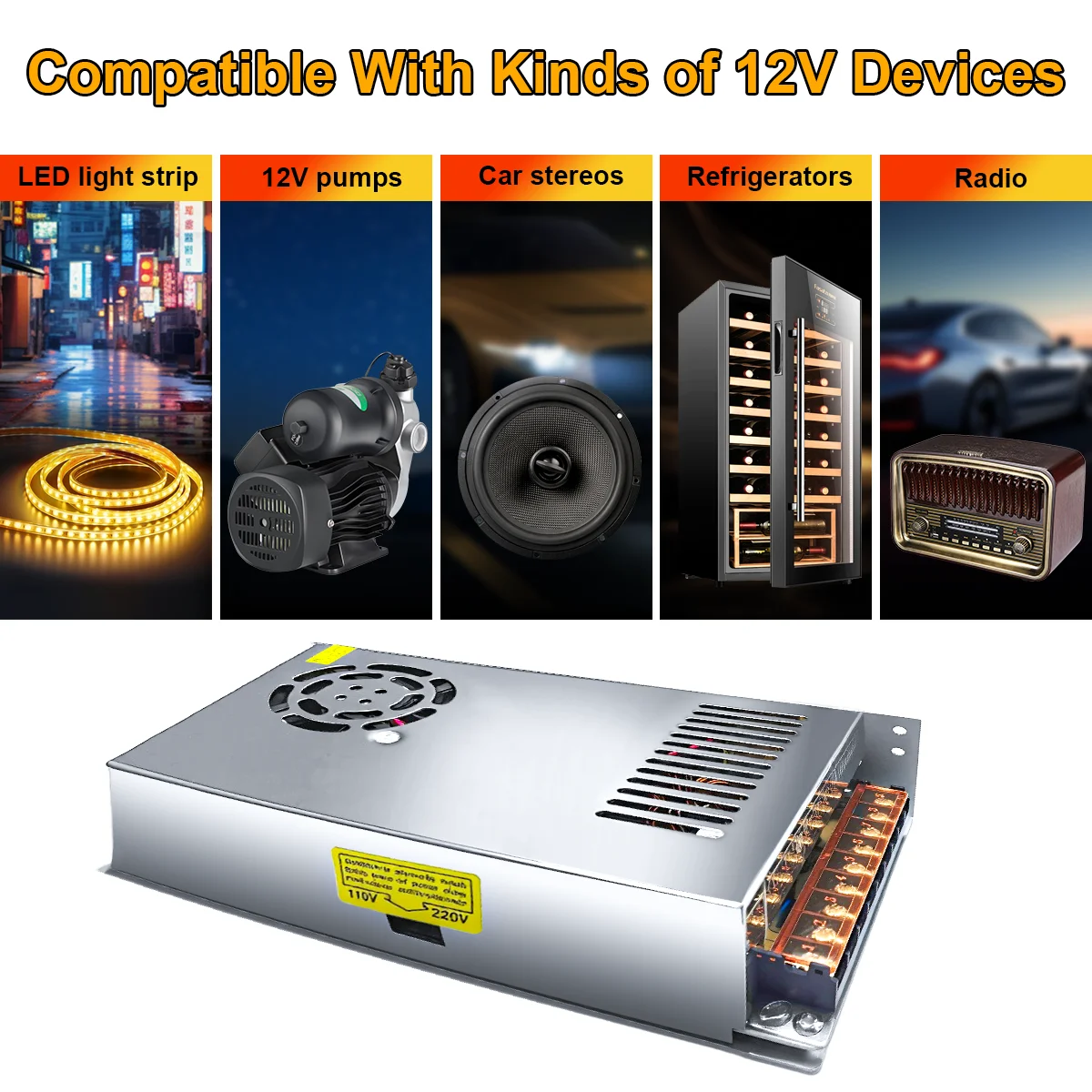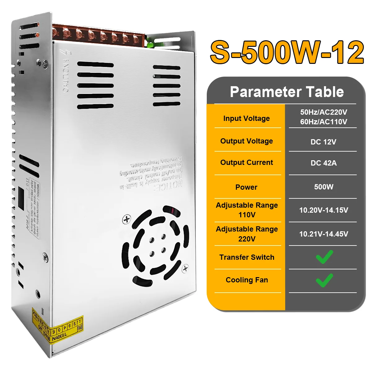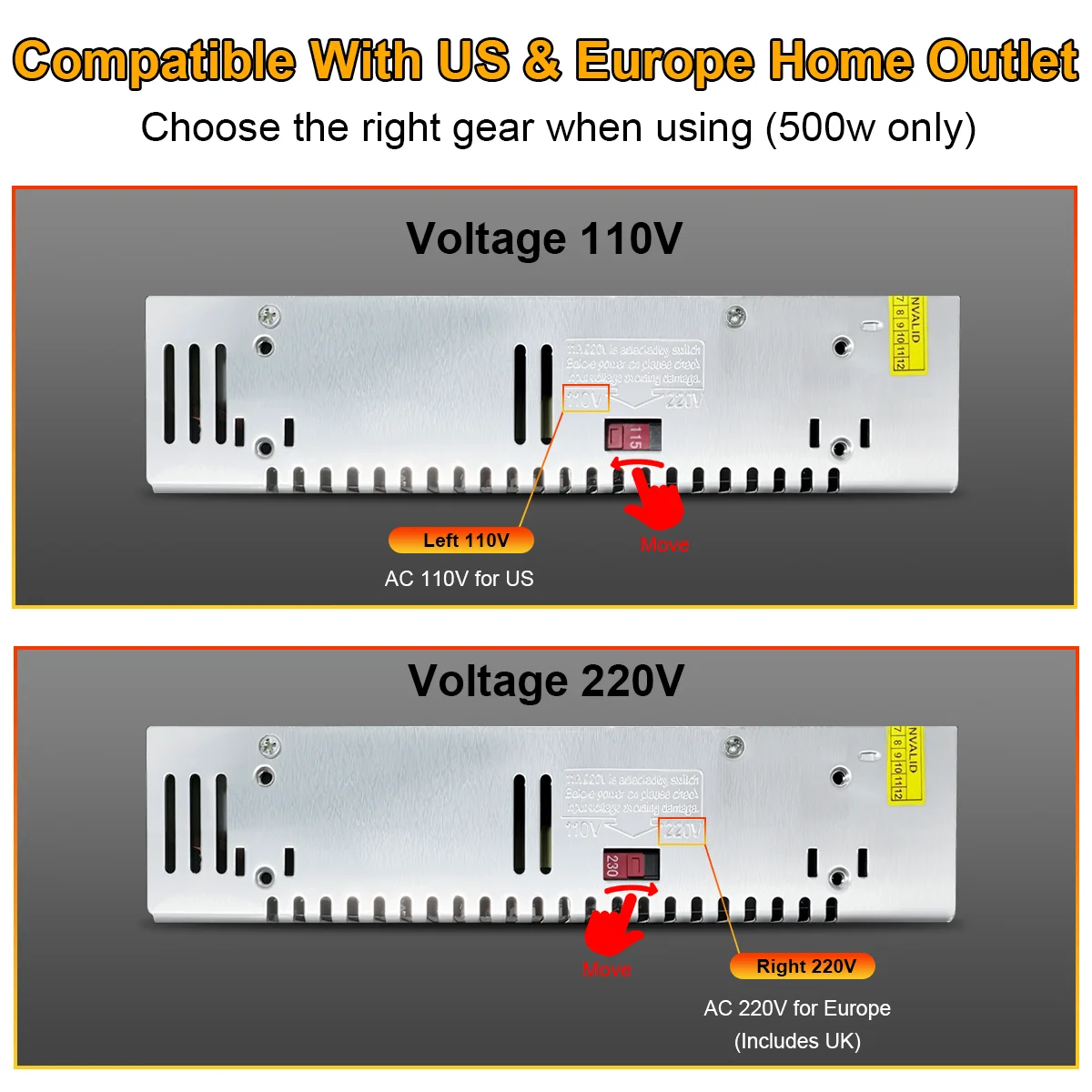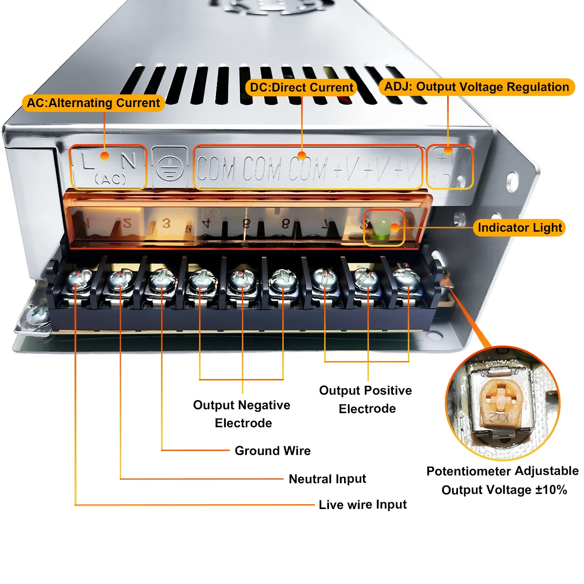 Conversion de l’alimentation du commutateurCA 110 V/220 VàCC 12 V 60 W/250 W/500 W.: La tension d’entrée par défaut est de 110 V, la tension de sortie est réglable de 10 %, le boîtier métallique avec de nombreux trous rend la dissipation thermique plus efficace.