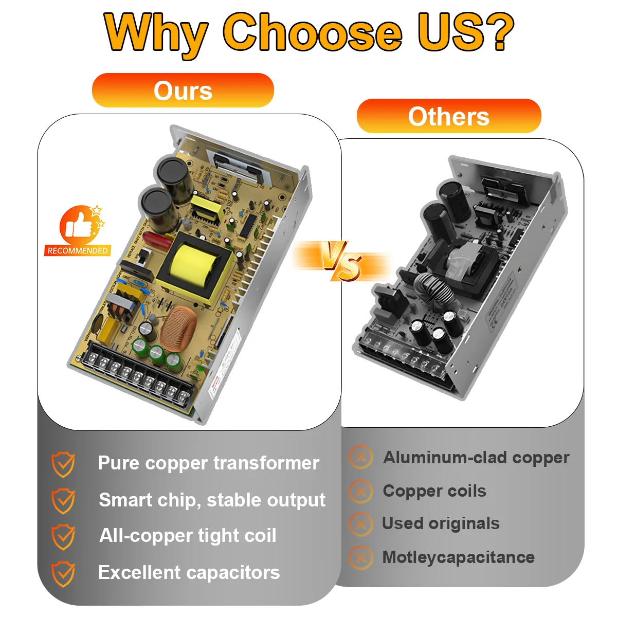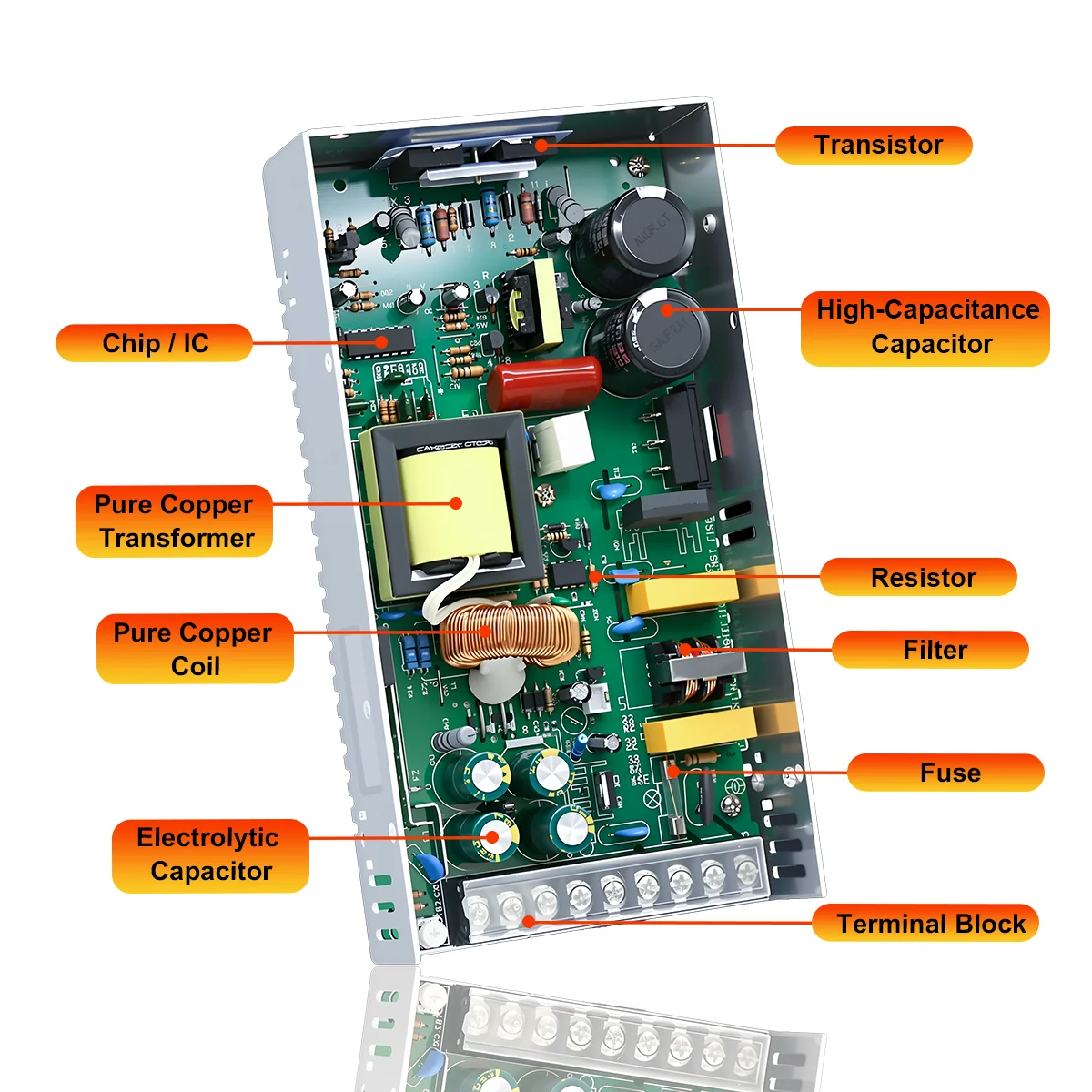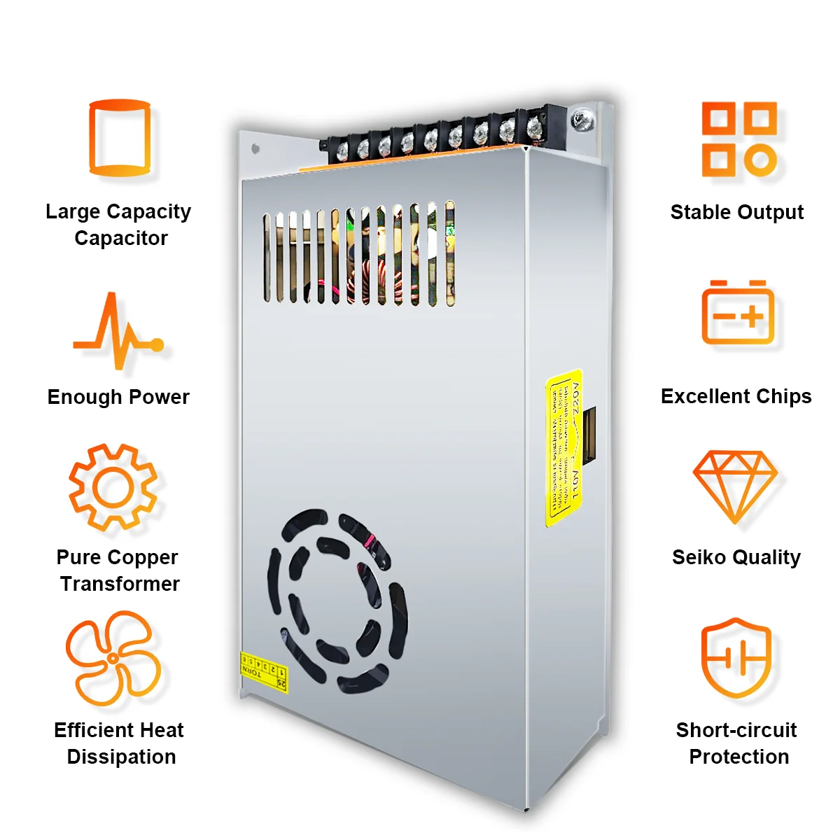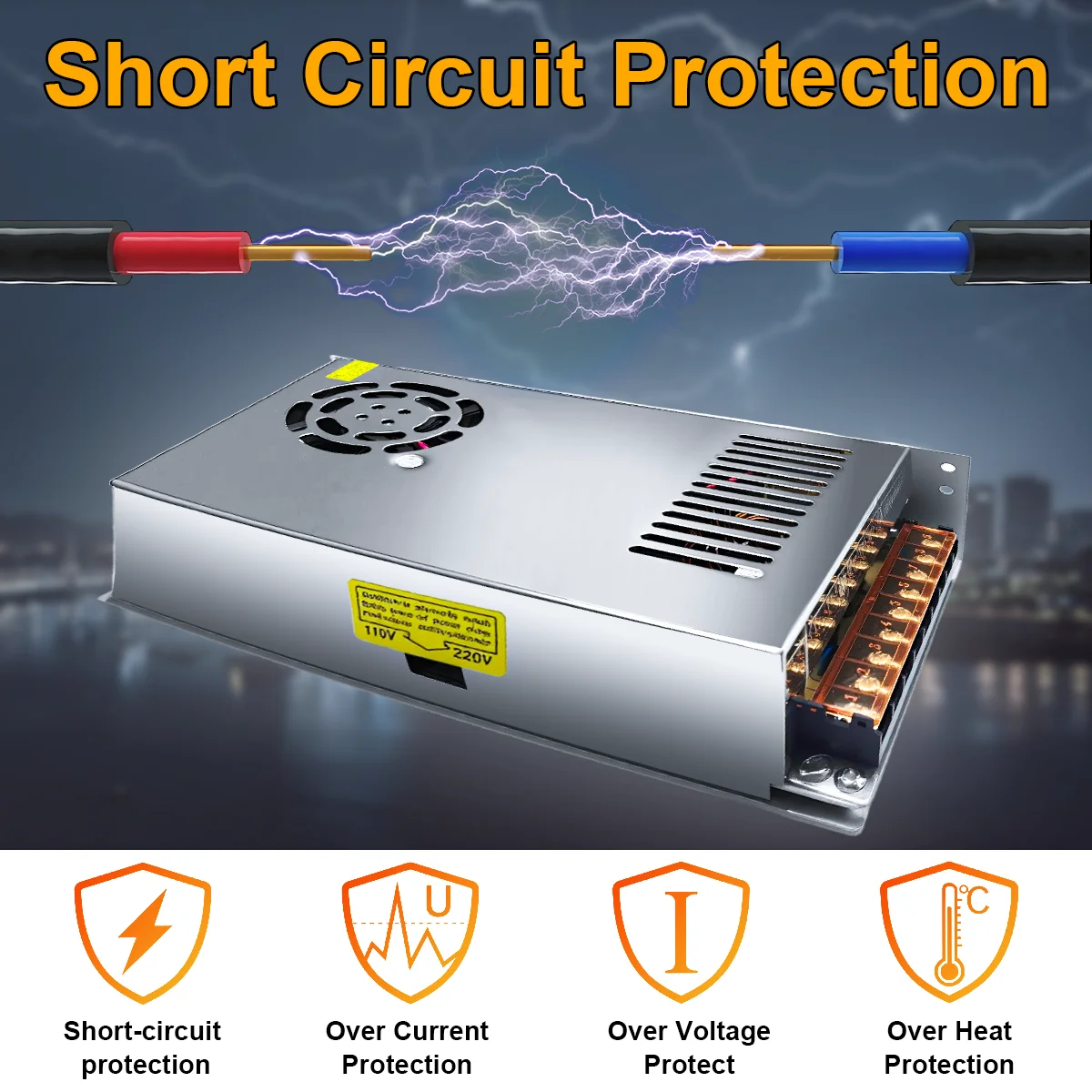 Conversion de l’alimentation du commutateurCA 110 V/220 VàCC 12 V 60 W/250 W/500 W.: La tension d’entrée par défaut est de 110 V, la tension de sortie est réglable de 10 %, le boîtier métallique avec de nombreux trous rend la dissipation thermique plus efficace.
