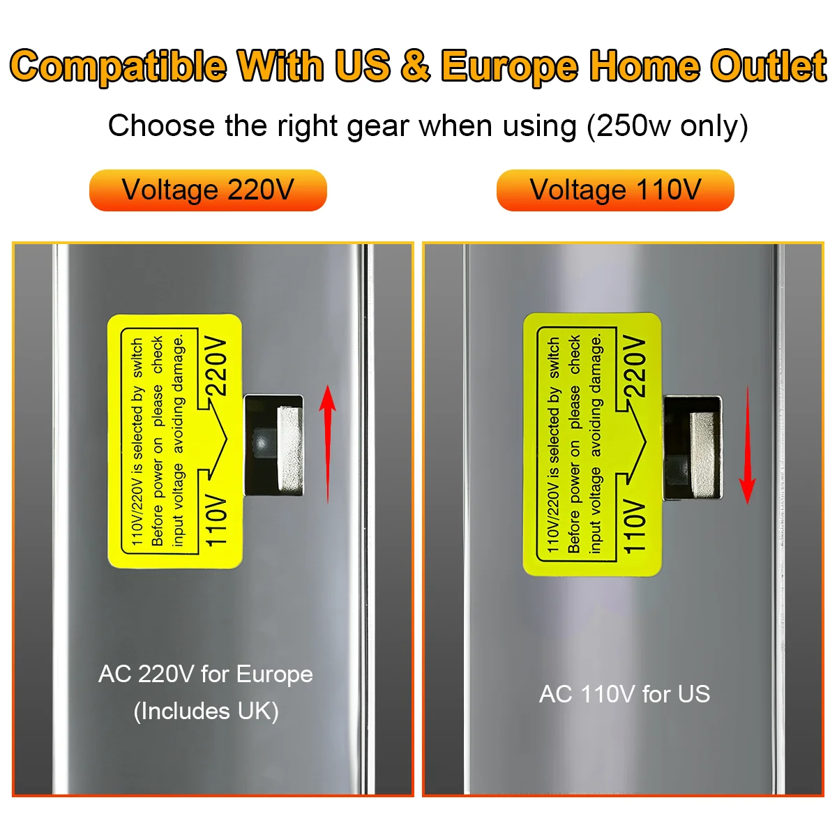 [Tension d’entrée CA 110 V/220 V]: Notre convertisseur fonctionne pour les deux 110 V/220 V, n’oubliez pas de régler l’interrupteur sur le côté 110 V/220 V avant utilisation.Quant au modèle (250 W/500 W), un sélecteur de tension situé sur le côté du commutateur qui est utilisé pour régler la tension d’entrée sur l’alimentation.