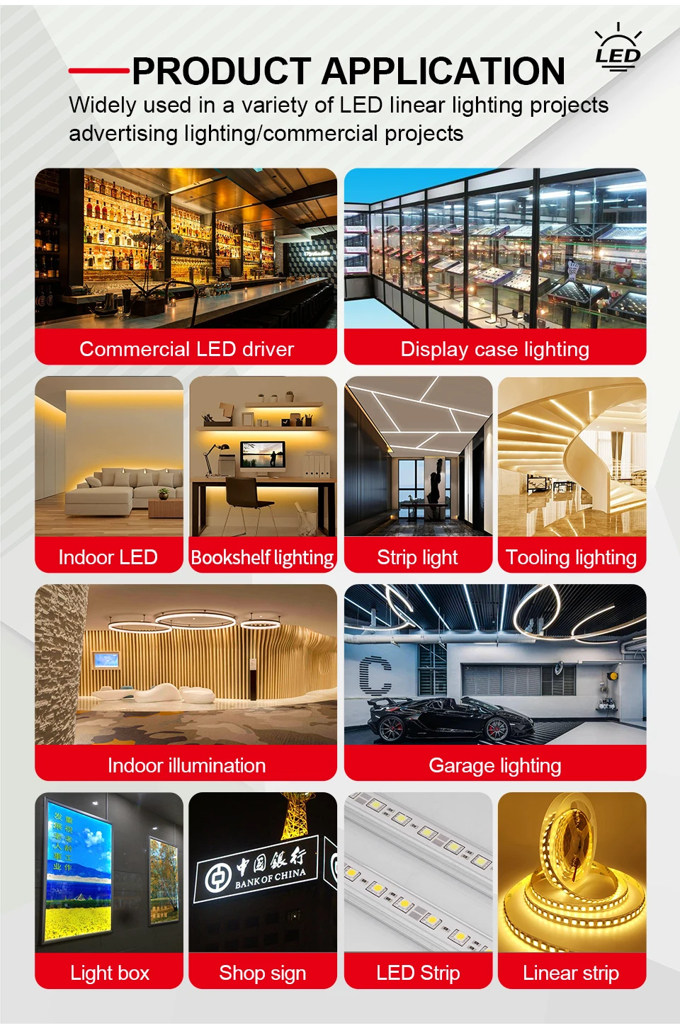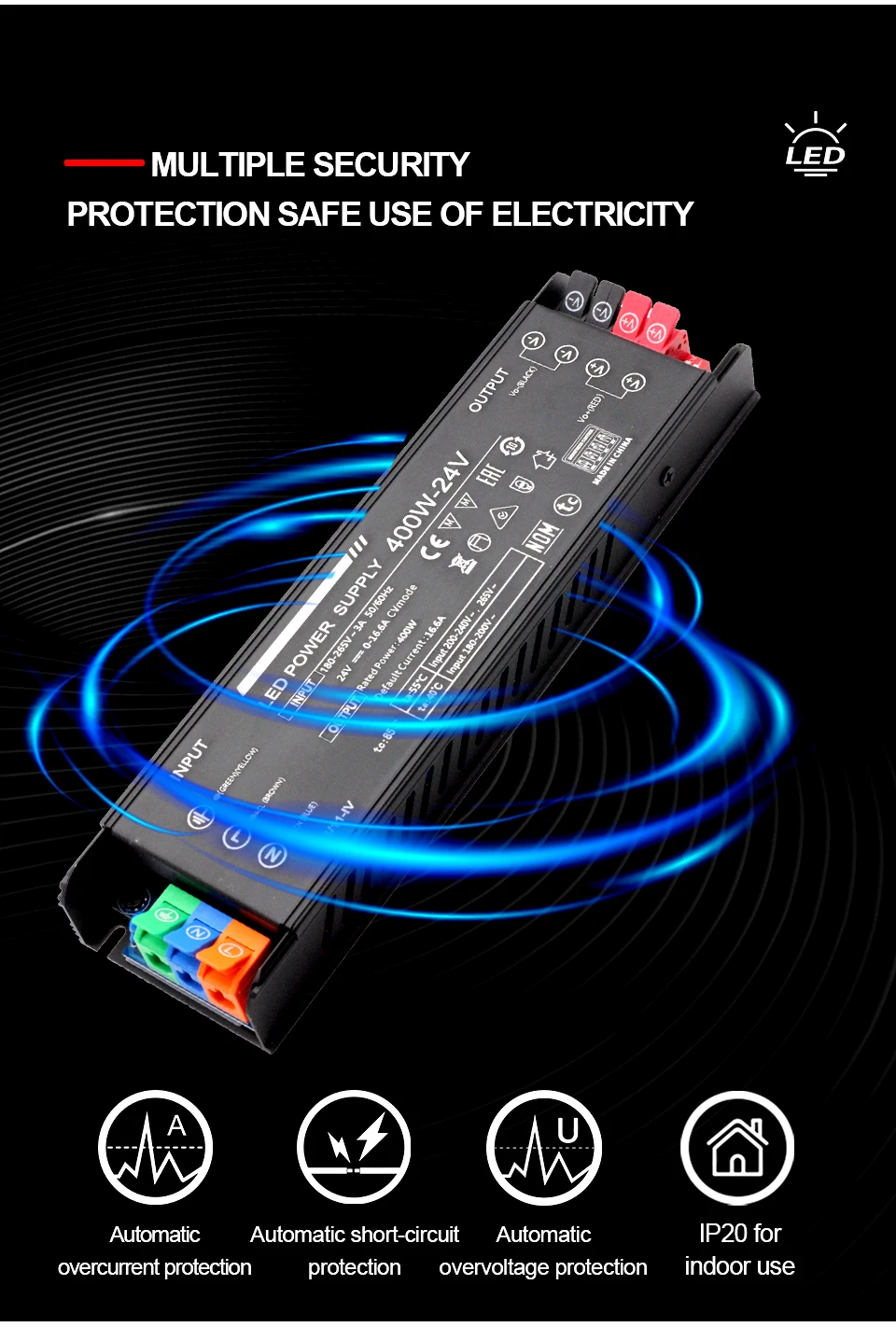 Cette alimentation est conçue pour l’éclairage LED : adaptée à diverses applications, telles que : panneaux d’affichage, panneaux de magasin, éclairage de décoration intérieure, bandes lumineuses LED, pilotes d’éclairage LED, caractères lumineux, affiches lumineux, lumières de vitrine LED, etc.