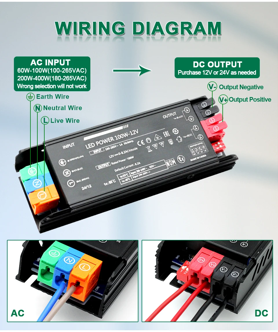 Alimentation LED AV vers DC 12V ou 24V, transformateur 60W, 100W, 200W, 300W, 400W, alimentation à découpageAlimentation LED AV vers DC 12V ou 24V, transformateur 60W, 100W, 200W, 300W, 400W, alimentation à découpage
