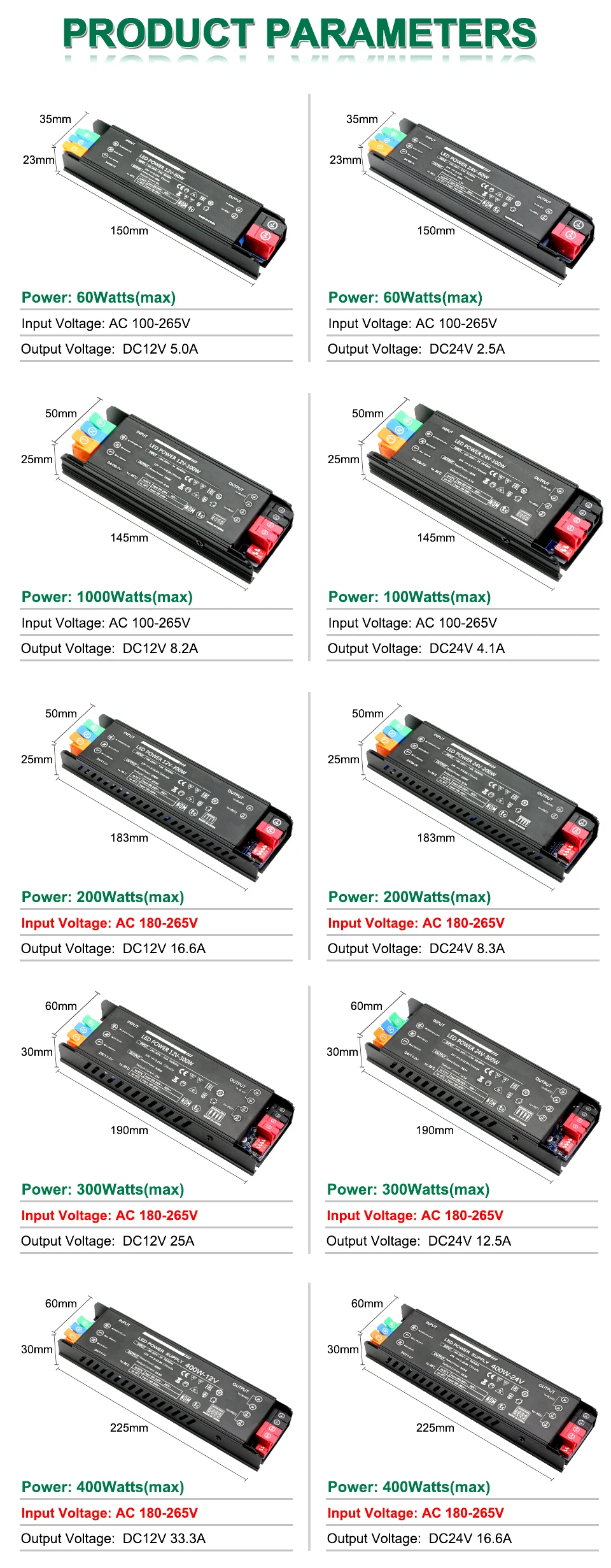 Tension d’entrée : 60W-100W (AC 100-265V) 200W-400W (AC 170-265V) (sélectionné selon la tension de la ville locale)