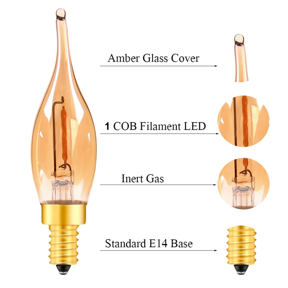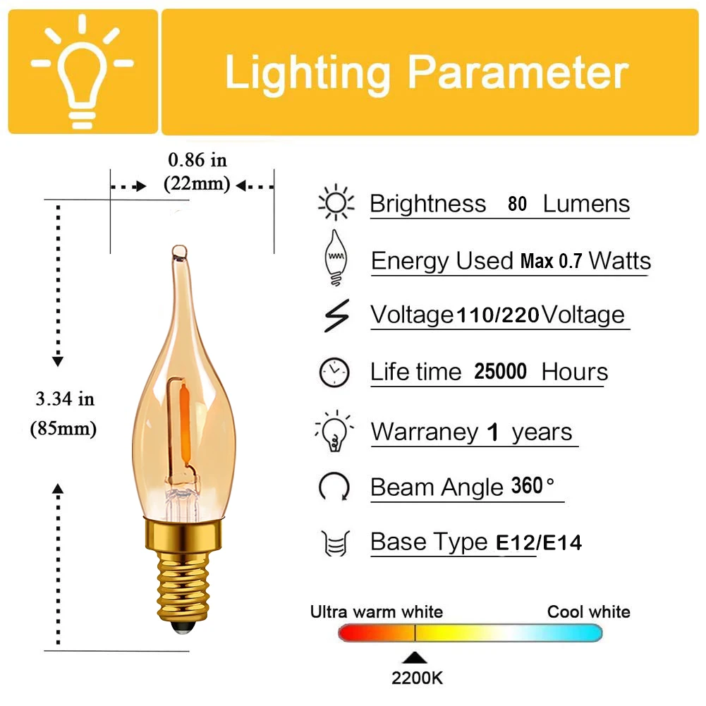 E14 Base LED Light: E14 C22T Bulbs for LED table lamps, 0,5W (4W Euiivalent) 220V-240V, Super Warm White 2200K, 50LM, E14 Socket with candelabrum base.
