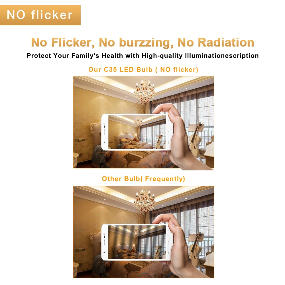 Variation fluide : sans scintillement, sans bouchage, sans stroboscope ni humidification, ampoule candélabre e12/e14 testée pour travailler avec la plupart des gradation LED pour une gradation fluide de 10% à 100 %.