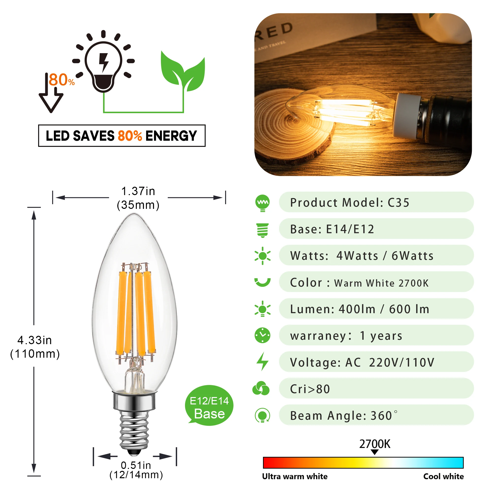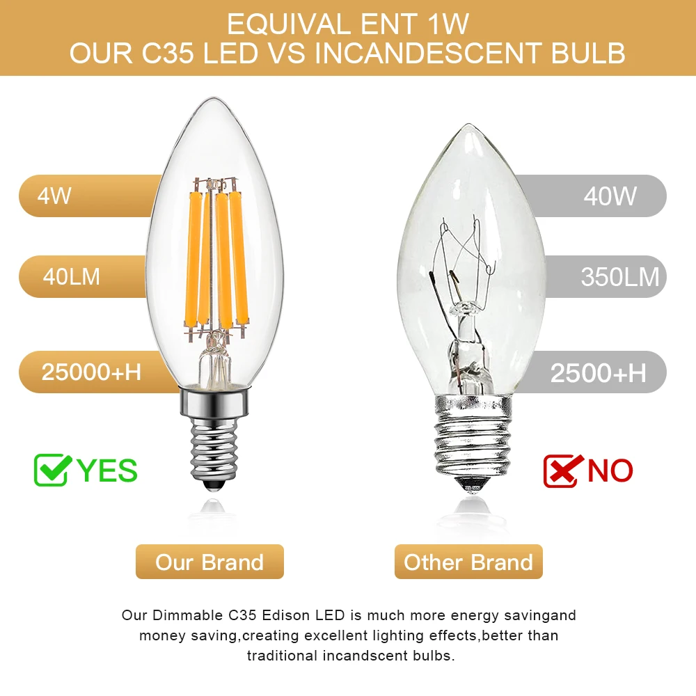 - Numéro de Modèle: Dimmable C35 E14 Led Light Bulb E14 220V E12 110V Filament Lamp 4W 6.