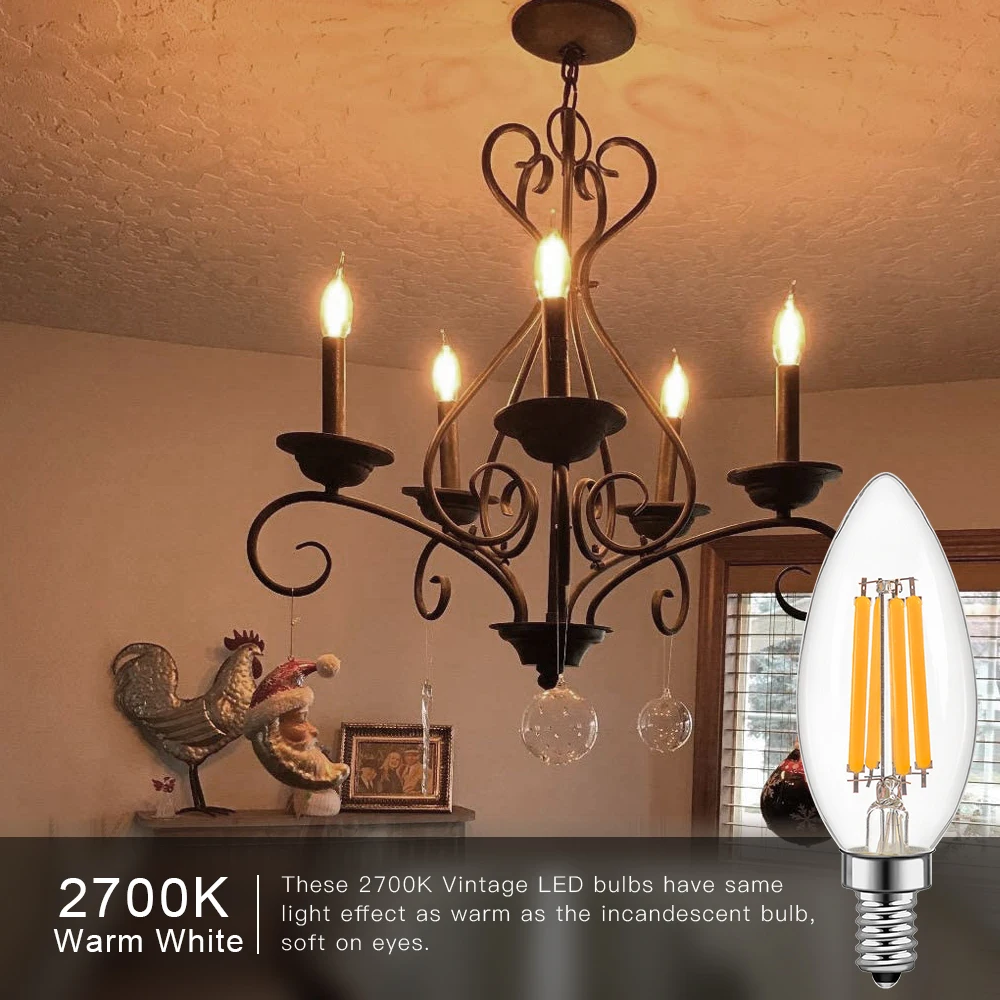 Lumière blanche douce 2700K : ampoules bougie LED C35 pour offrir une lumière blanche chaude 2700K, 320° L’angle de faisceau fait un écart lumineux pour plus de zones de la pièce.Éclairage confortable, sans éblouissement, lumineux mais non aveugle.
