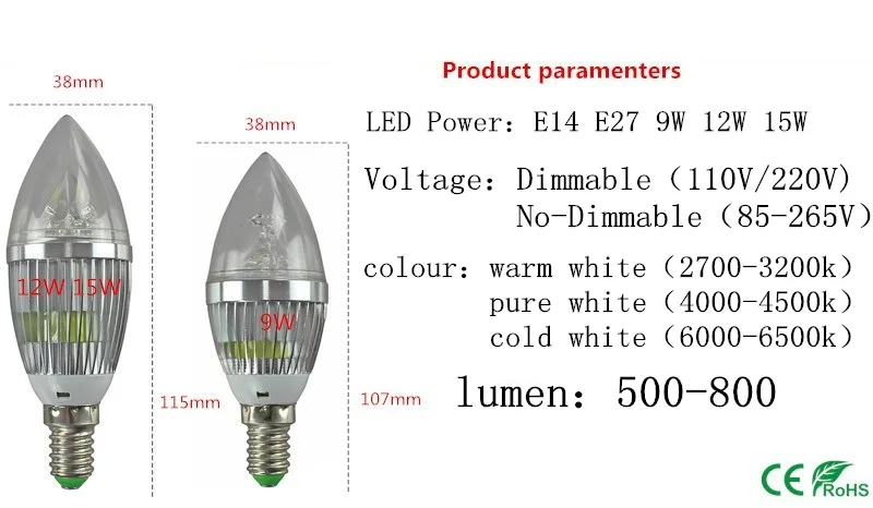 Spécifications :Type de base : bougie LED E14 E27.