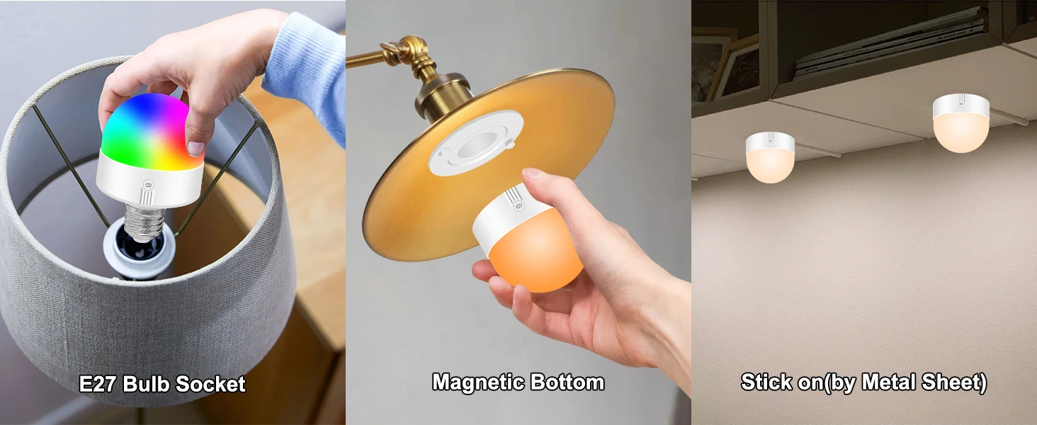 Méthode d’installation double magnétique + vis : compatible avec les luminaires à visser standard E26/E27. La base prend également en charge le montage magnétique, permettant une installation facile sur les surfaces métalliques et l’expansion des scénarios d’utilisation.