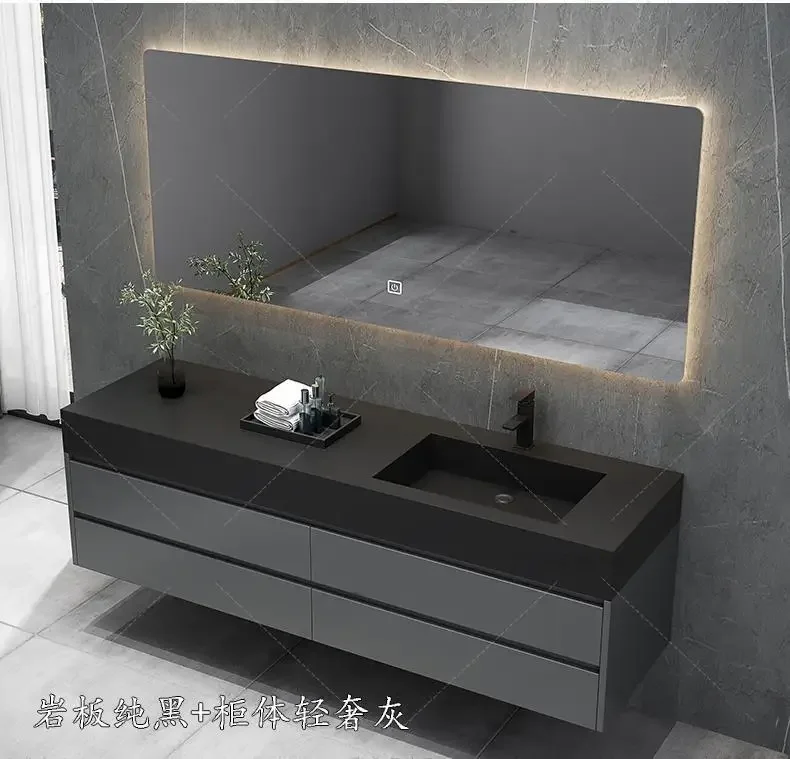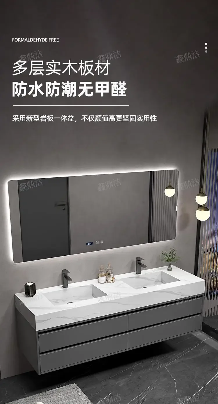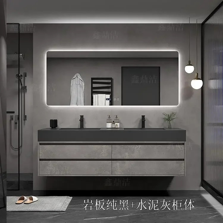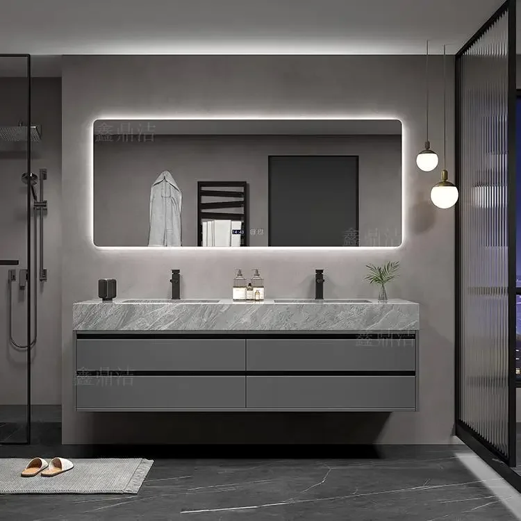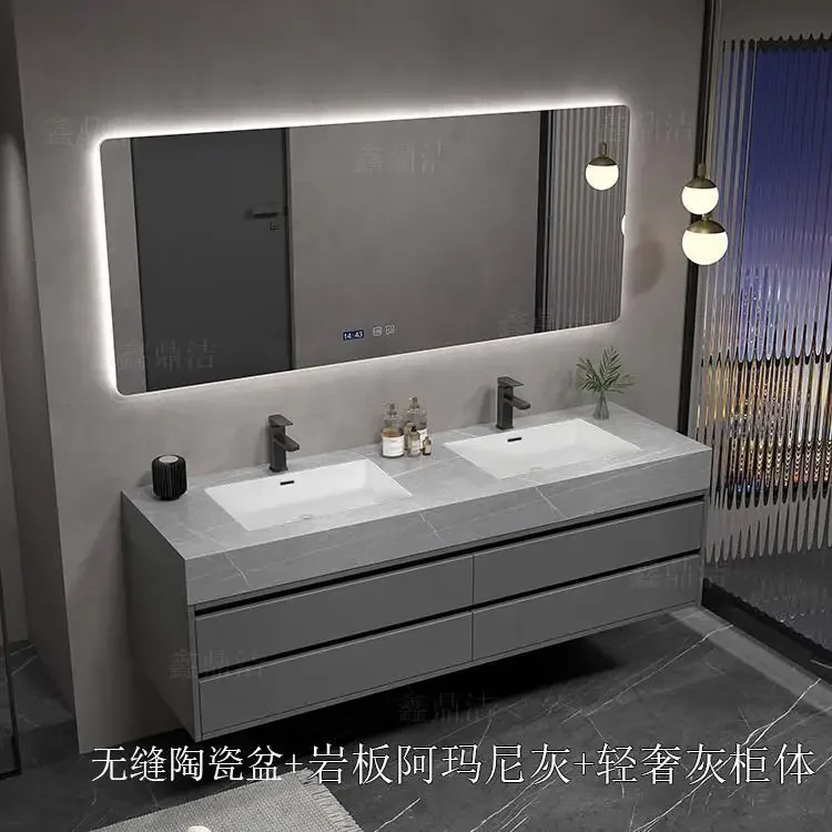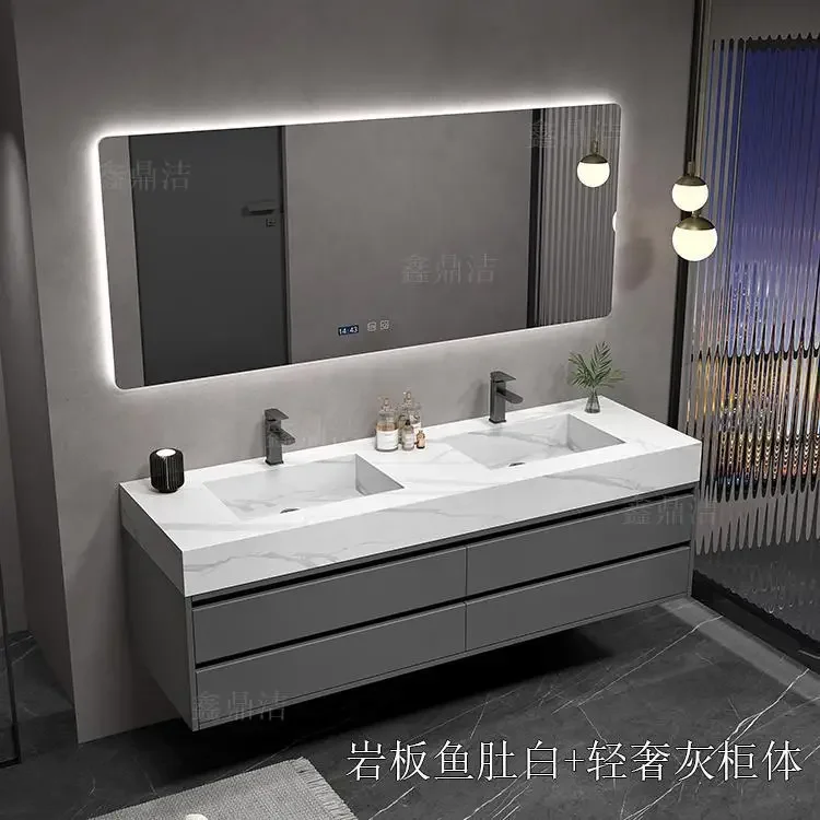 Armoire de salle de bain grise, dalle de roche, évier en céramique intégré, combinaison de miroirs, tiroir de lavage, meuble de rangement à Double lavabo