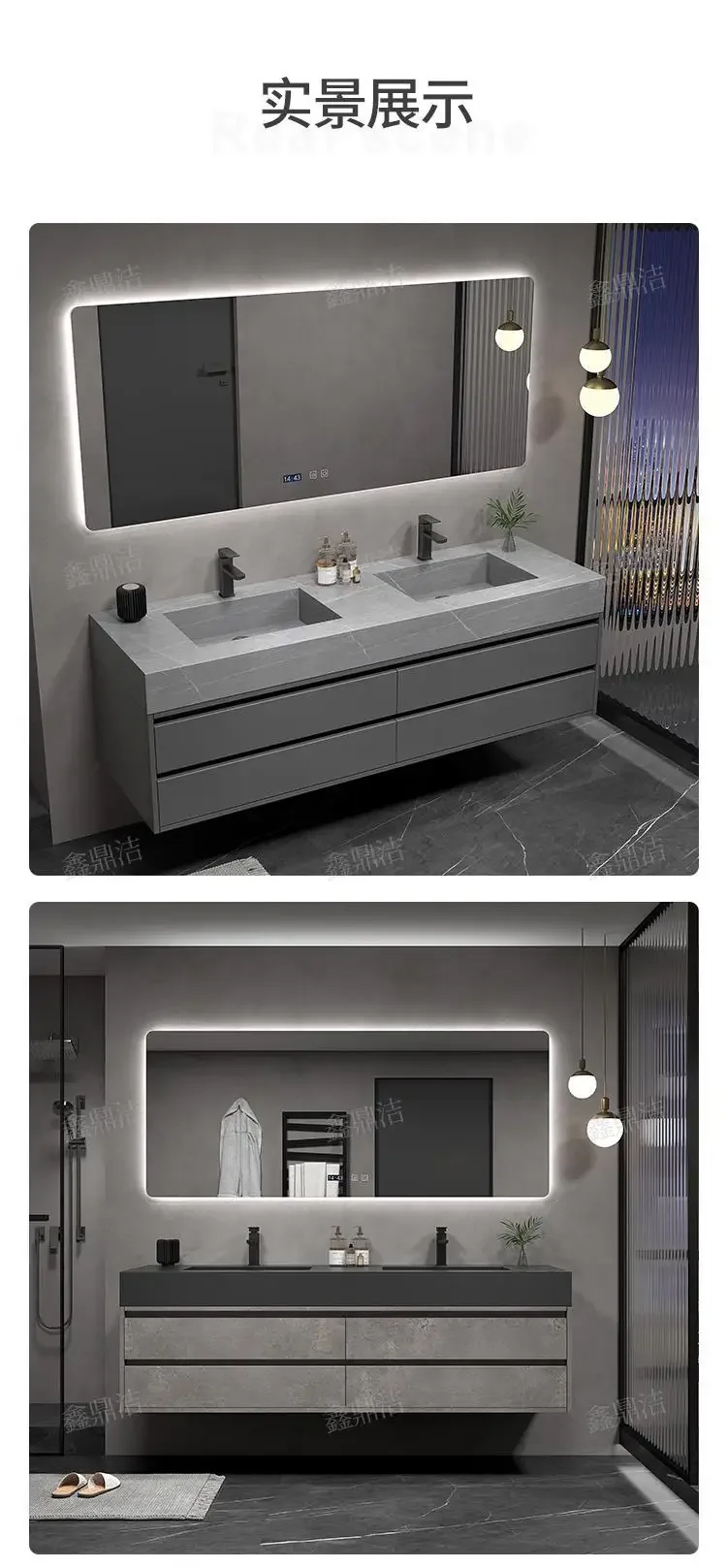Armoire de salle de bain grise, dalle de roche, évier en céramique intégré, combinaison de miroirs, tiroir de lavage, meuble de rangement à Double lavaboArmoire de salle de bain grise, dalle de roche, évier en céramique intégré, combinaison de miroirs, tiroir de lavage, meuble de rangement à Double lavabo
