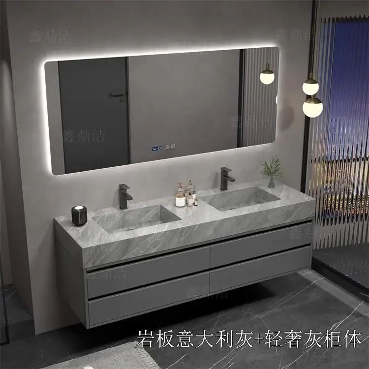 Armoire de salle de bain grise, dalle de roche, évier en céramique intégré, combinaison de miroirs, tiroir de lavage, meuble de rangement à Double lavabo