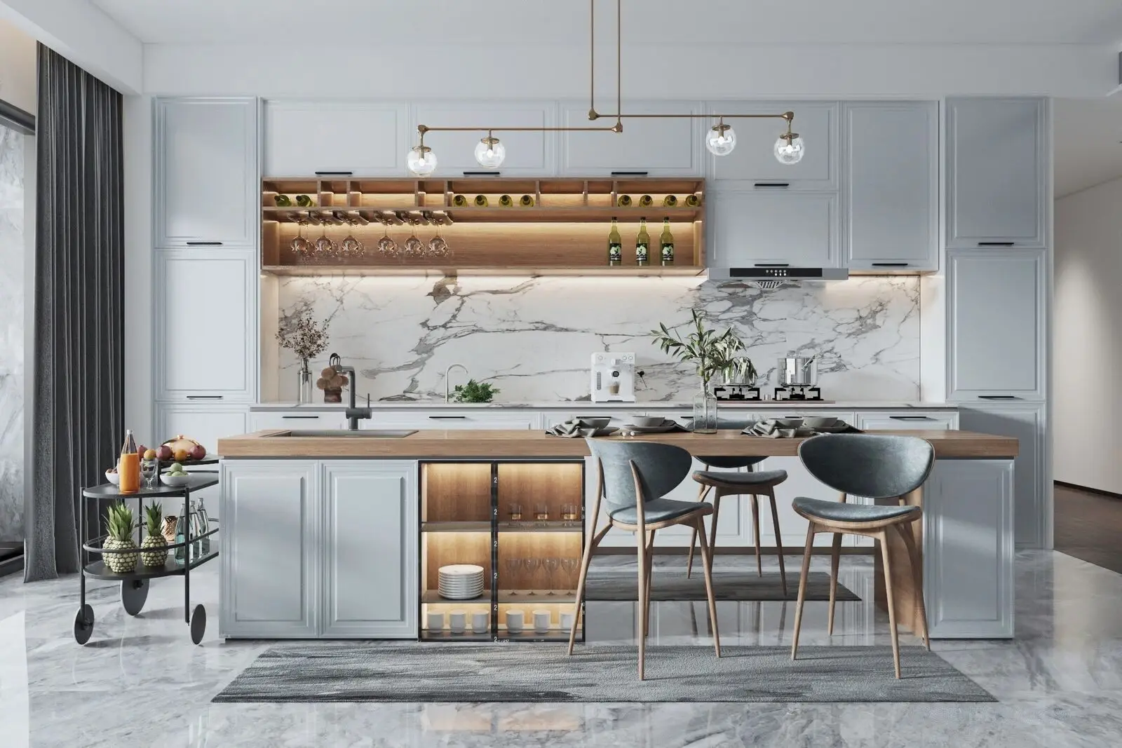 armoires cuisine îlot évier intégré acier inoxydable 304 alimentaire modulaire personnalisable brillante marbre blanc veines noires accents olive