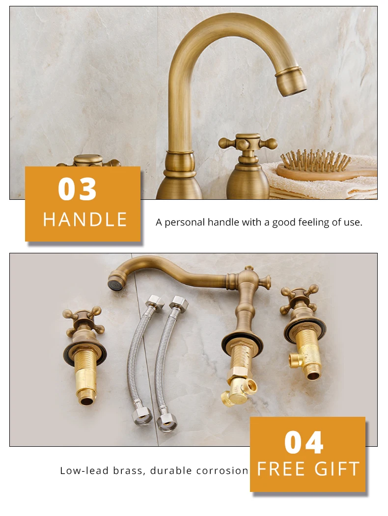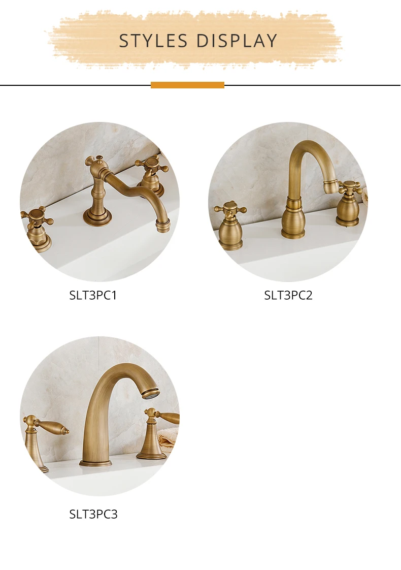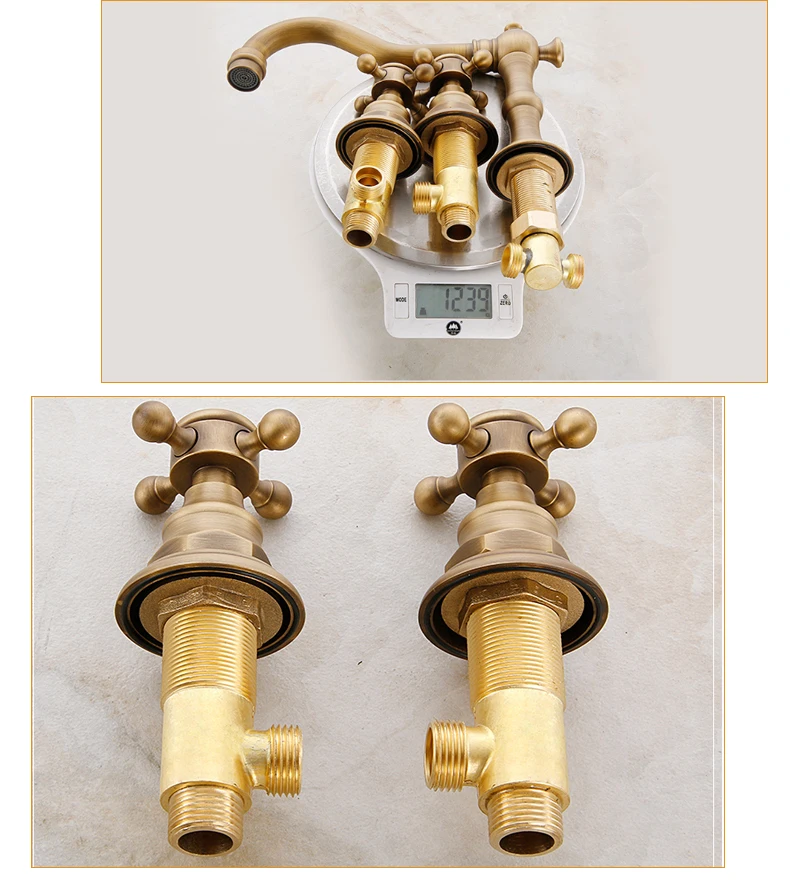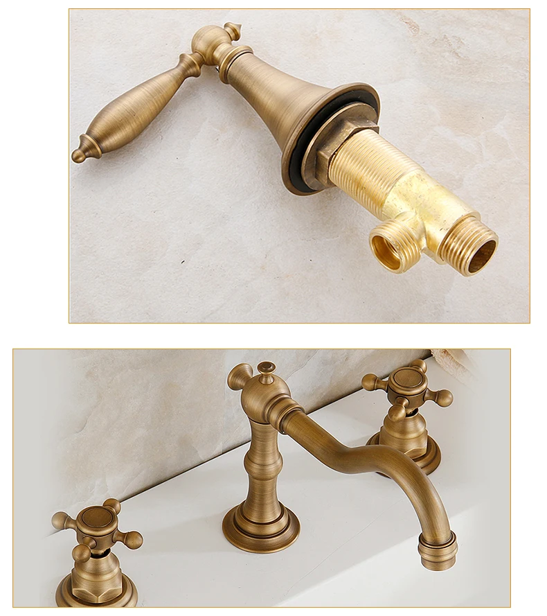 Robinets de lavabo en laiton antique Robinet mitigeur de baignoire monté sur le pont Ensemble de robinet de salle de bain à double poignée 3 trous Robinet d’eau