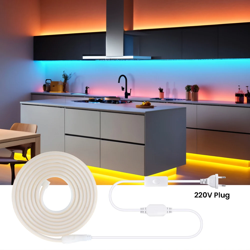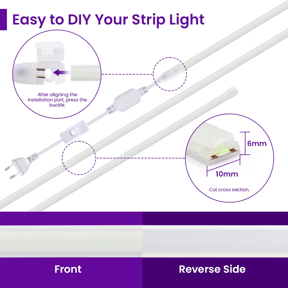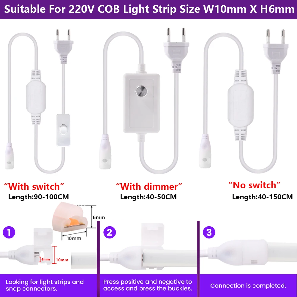 3.Ce prise est conçue spécifiquement pour les bandes lumineuses LED COB 220 V-240 V avec spécifications de 10 x 6-7 mm, prenant en charge les bandes lumineuses jusqu’à 100 mètres de longueur.