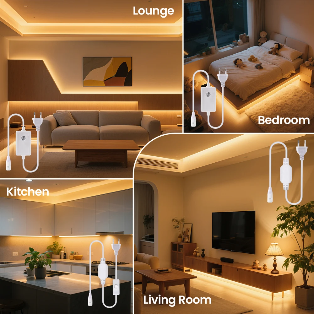 3. Cette prise est conçue spécifiquement pour les bandes lumineuses LED COB 220 V-240 V avec des spécifications de 10 x 6 à 7 mm, prenant en charge des charges de bandes lumineuses jusqu’à 100 mètres de longueur.