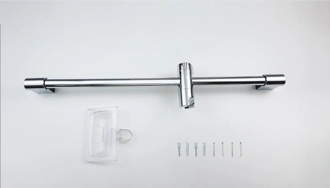 Matériau : barre coulissante en acier inoxydable + support ABS + douchette à main ABS + porte-savon ABS + tuyau en acier inoxydable.