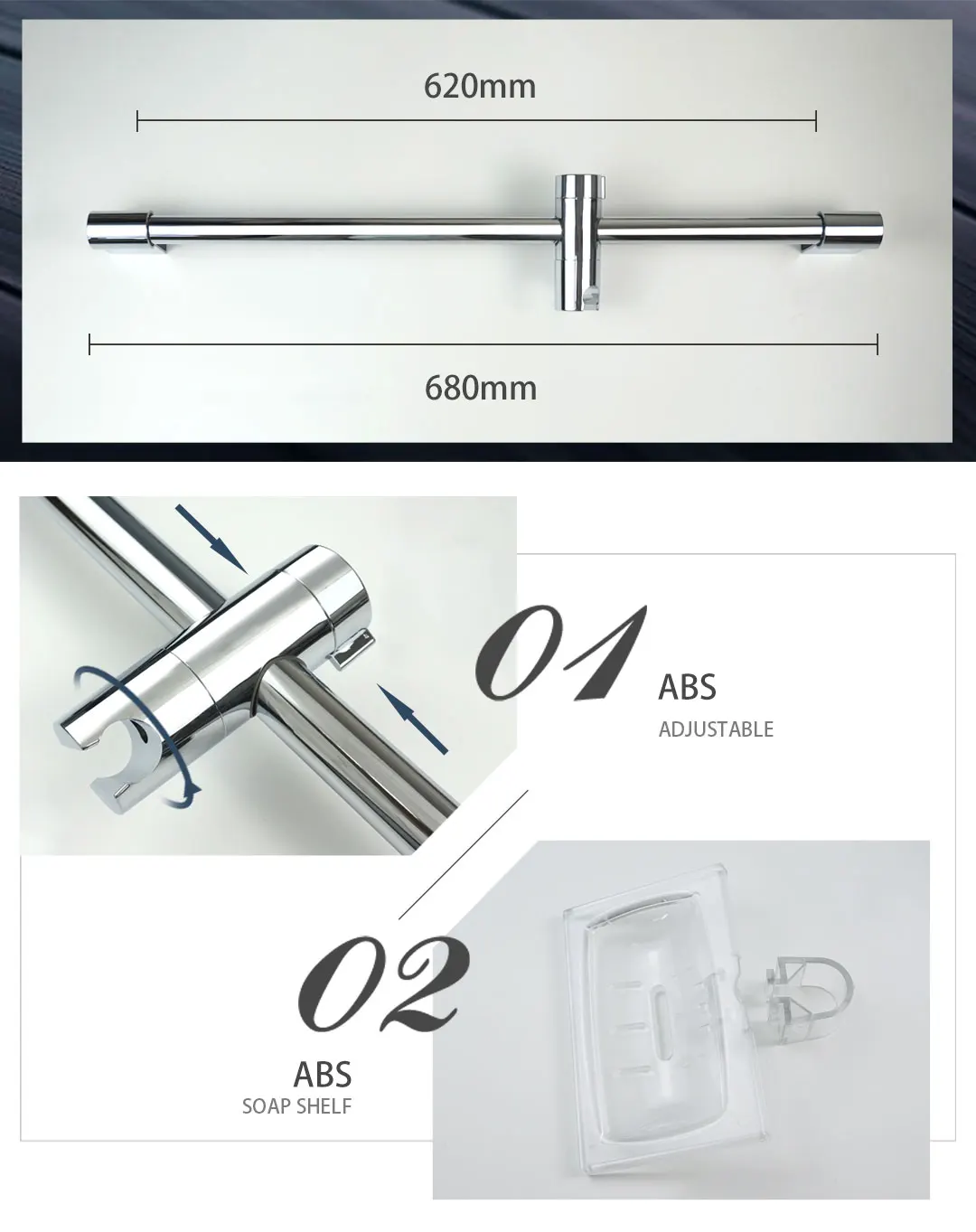 Matériau : barre coulissante en acier inoxydable + support ABS + douchette à main ABS + porte-savon ABS + tuyau en acier inoxydable