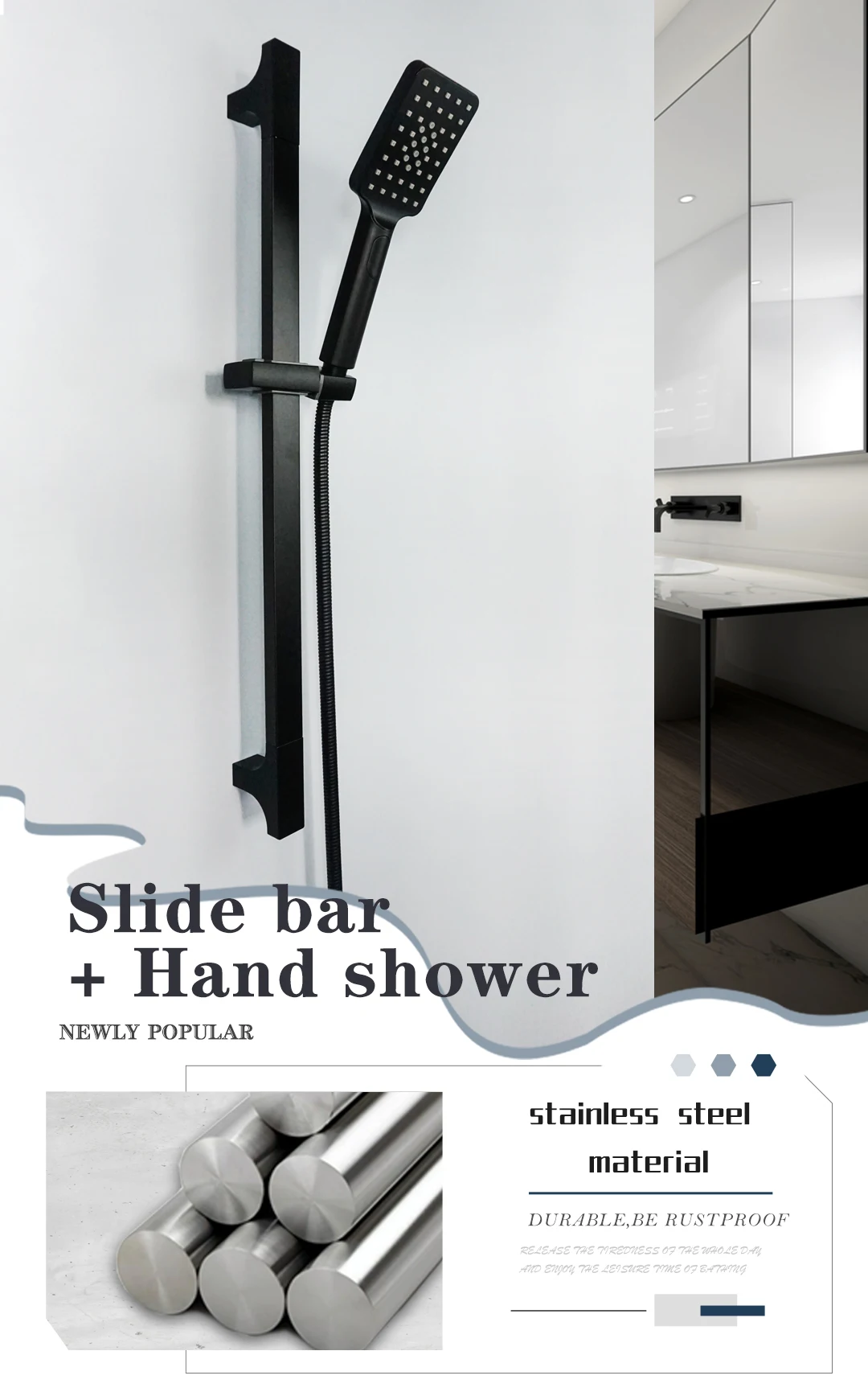 Matériau: rail coulissant en acier inoxydable + douchette en ABS + tuyau de douche de 1.5m