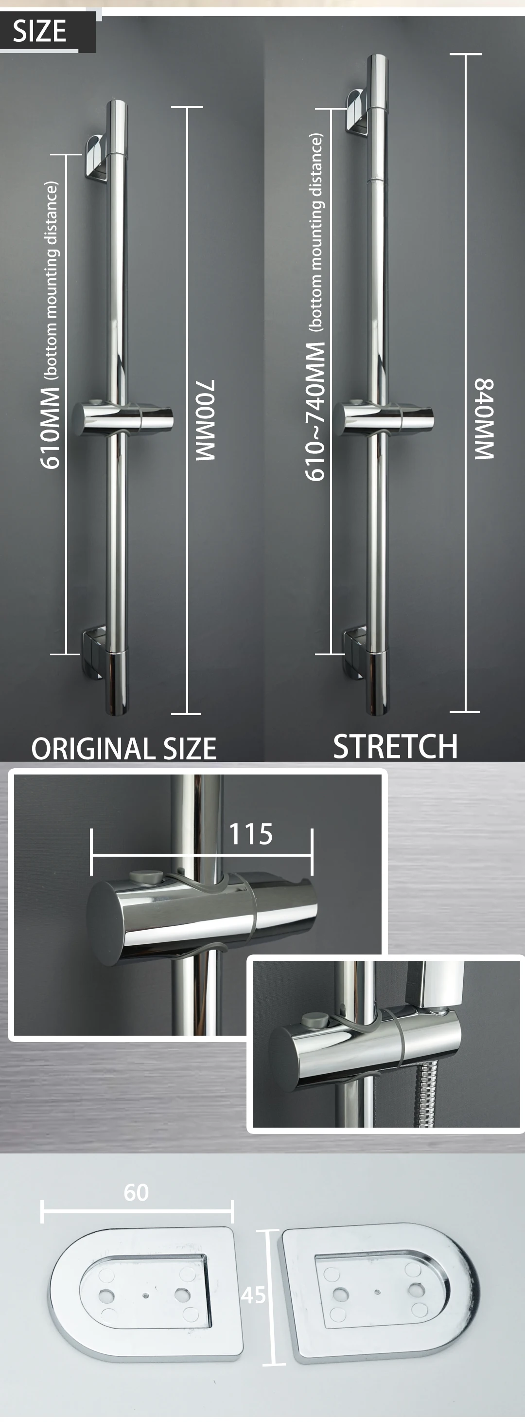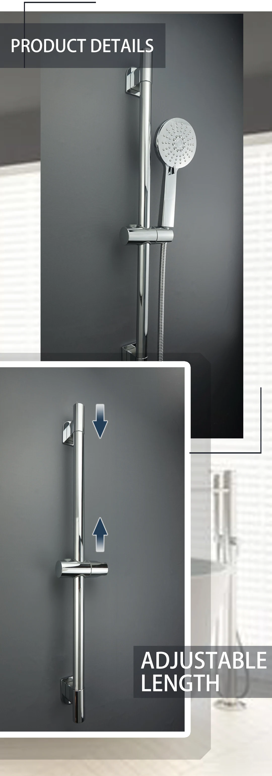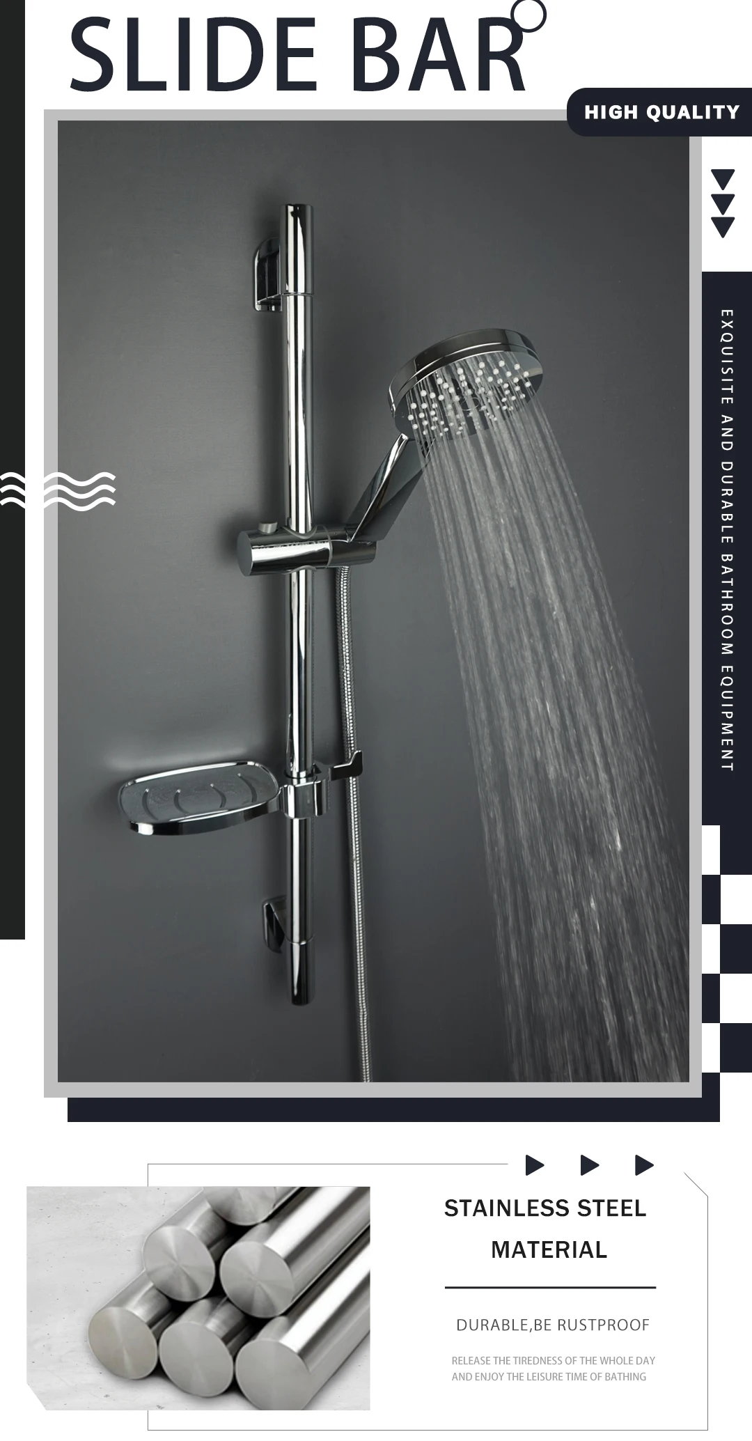 Barre coulissante : barre coulissante en acier inoxydable SUS304 + support de pomme de douche ABS