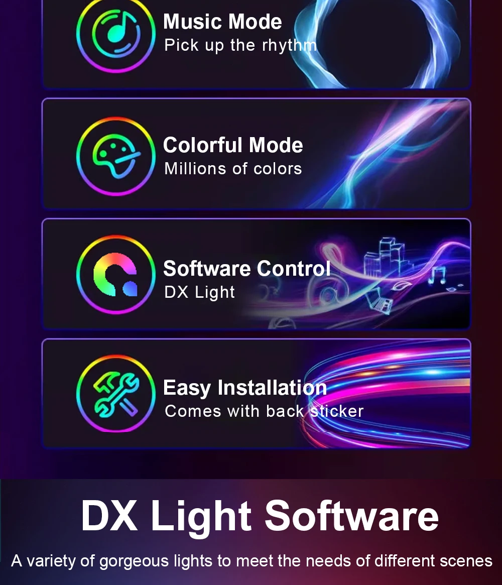 Avec une télécommande personnalisable, cette rétroéclairage RVB propose 4 températures de couleur réglables (2700K-7500K), gradation de luminosité infinie et 7 modes RVB vibrants pour correspondre à vos préférences humaines.L’option de lumière blanche fournit une éclairage polyvalent pour le bureau à domicile, la lecture, le divertissement et les loisirs.L’abat-jour transparent, doté d’une texture délicate, minimise l’éblouissement direct et la mimique de la lumière naturelle, créant un environnement confortable et immersif pour une utilisation prolongée.
