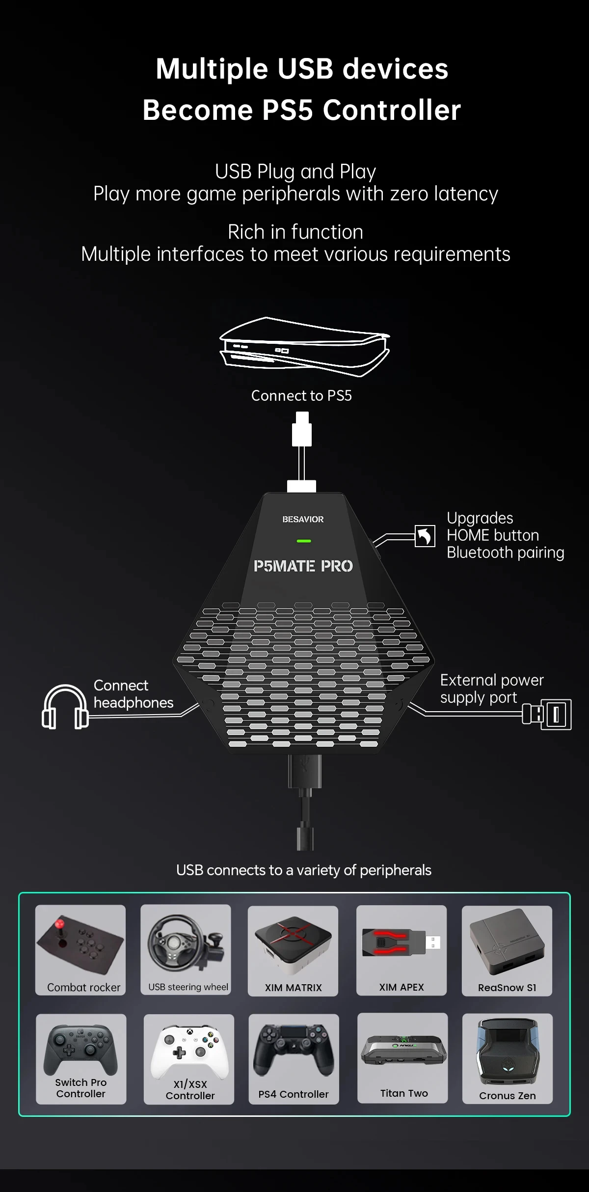 Besavior P5Mate Pro convertisseur adaptateur émulateur, prend en charge le dernier système PS5 et PS5 Pro, USB est directement connecté, plug et plaBesavior P5Mate Pro convertisseur adaptateur émulateur, prend en charge le dernier système PS5 et PS5 Pro, USB est directement connecté, plug et pla