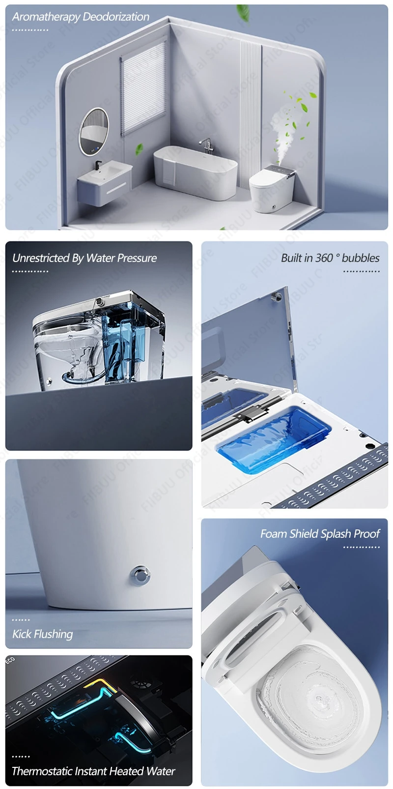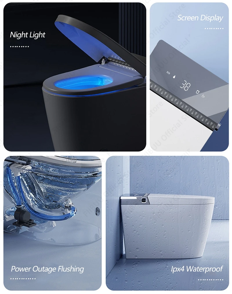 ● Sans restriction par la pression de l’eau ● Bouclier en mousse anti-éclaboussures ● Flip automatique du couvercle ● Anneau de siège ouvert coup de pied ● Stérilisation de la tige par pulvérisation ● Lumière chaude infrarouge ● Désodorisation d’aromathérapie ● Éclairage ambiant ● Mémoire double utilisateur ● Reconnaître le rinçage grand-petit ● Eau chauffée instantanée ● Chauffage par anneau de siège ● Pré-humide ● Température du siège réglable. ● Goutte lente silencieuse ● Imperméable Ipx4 ● Lavage oscillant ● Lavage de panne de courant ● L’eau de coup de pied ● Lavage des hanches ● Protection contre les fuites ● Lavage automatique ● Lavage féminin ● Lavage des enfants ● Température de l’eau réglable. ● Séchage à l’air chaud ● Température d’air réglable. ● Boom autonettoyant ● Pressure d’eau réglable ● Écran d’affichage ● Télécommande ● Lumière chaude infrarouge