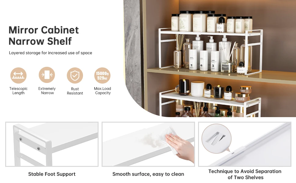 Boîte de rangement pour armoire à miroir de salle de bain, organisateur de cloison d’armoire de salle de bain, combinaison de support de rangement pour cosmétiques, organisation en couches
