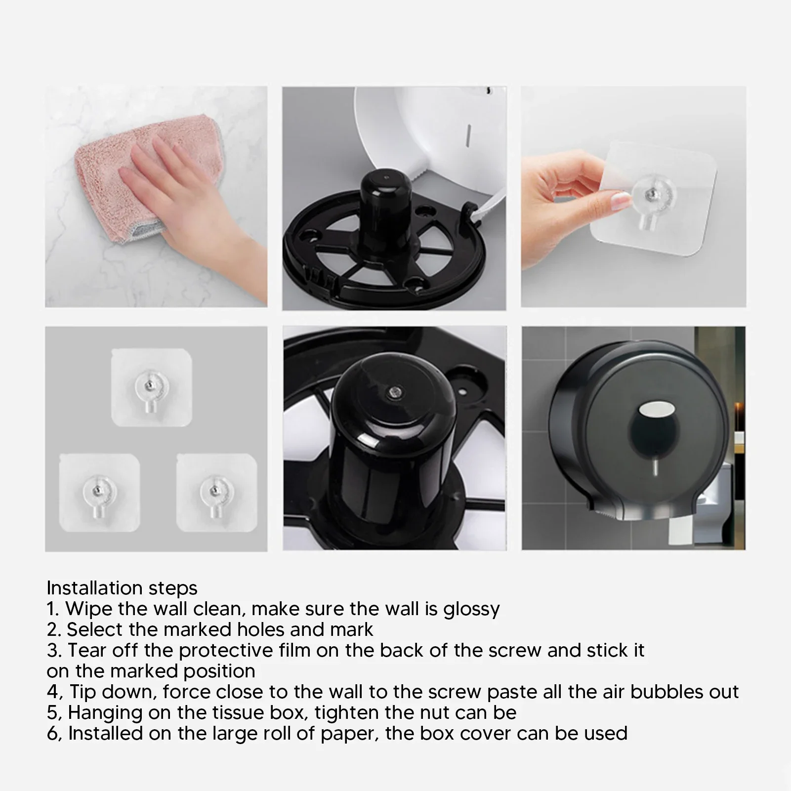 3.Pas de perforation : Le distributeur de rouleaux de papier toilette est conçu sans perforation, facile à installer, adapté aux toilettes et aux salles de bains, etc.