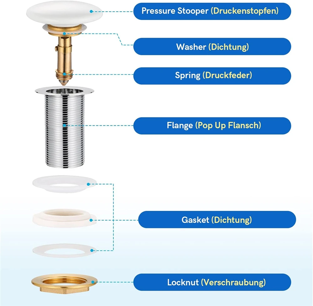 👍 Pop Up Waste Set – Équipé d’un noyau à ressort de haute qualité, le set de déchets d’évier ouvre ou fermer immédiatement avec la poussée d’un doigt utilisant le mécanisme pop-up. Pas de plus de soucis coincé. Quand le nettoyage est requis, simplement déparaît le couvercle en céramique.