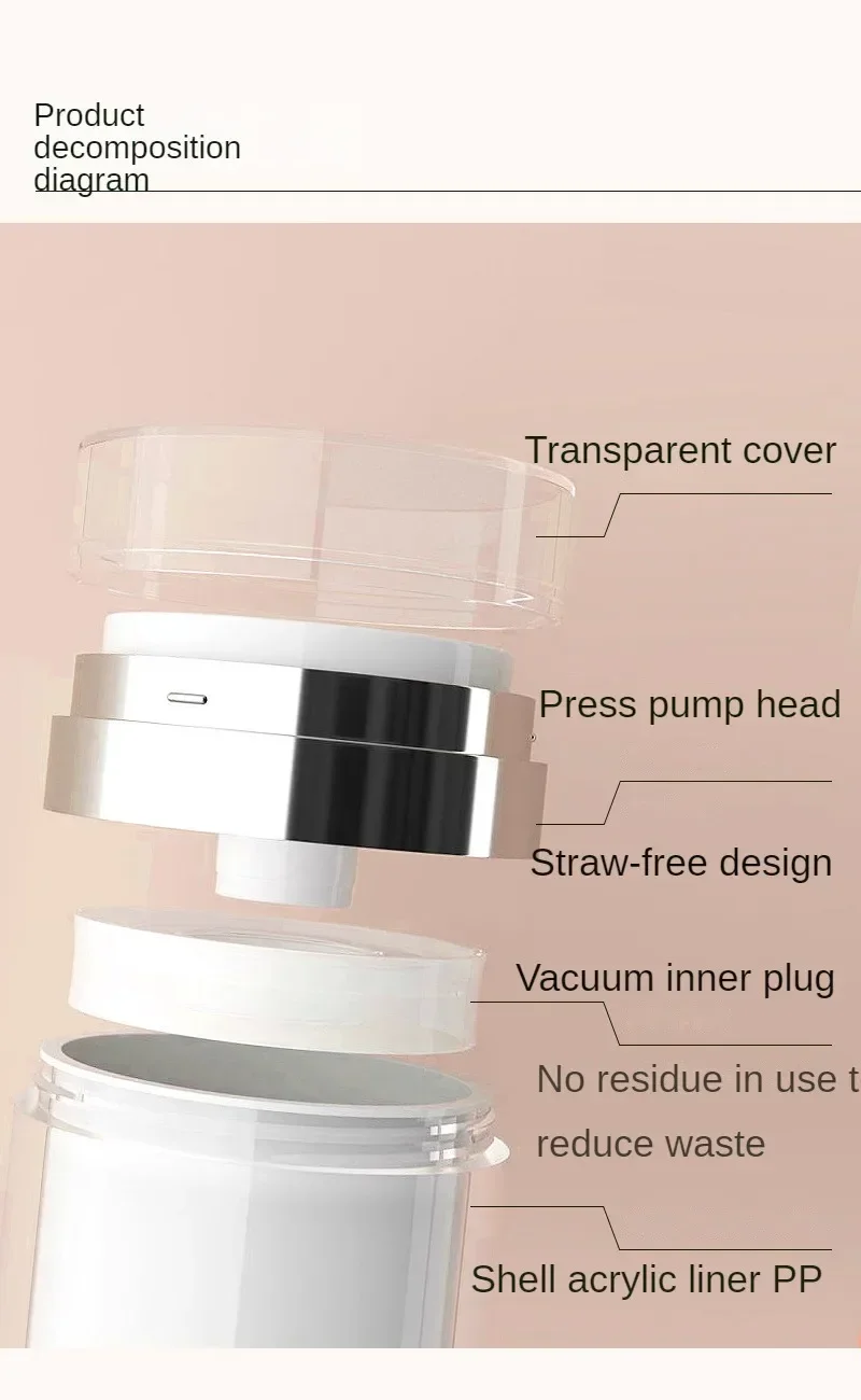 4. Utilisation : Vous devez remplir initialement votre pot au sommet avec le produit souhaité pour créer l’aspirateur. Quand la pompe est pressée un piston au fond du récipient poussera le produit vers le haut et hors du haut.