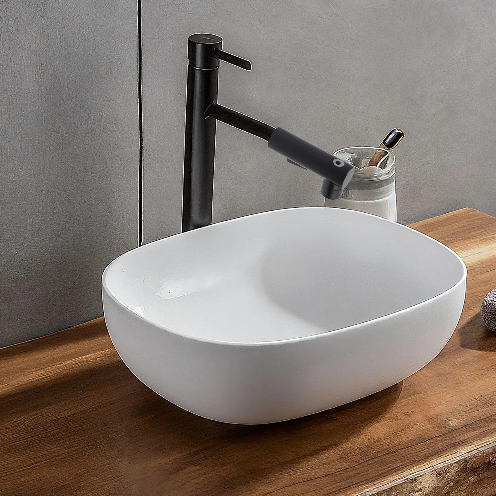 Choisissez un robinet haut (25-35 cm) pour que le bec passe au-dessus de la vasque. Portée recommandée : 12-18 cm.