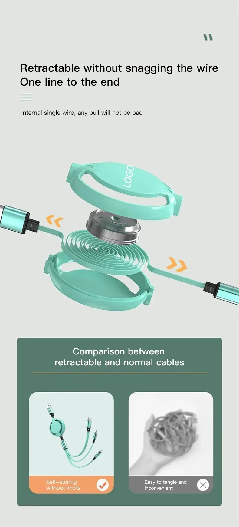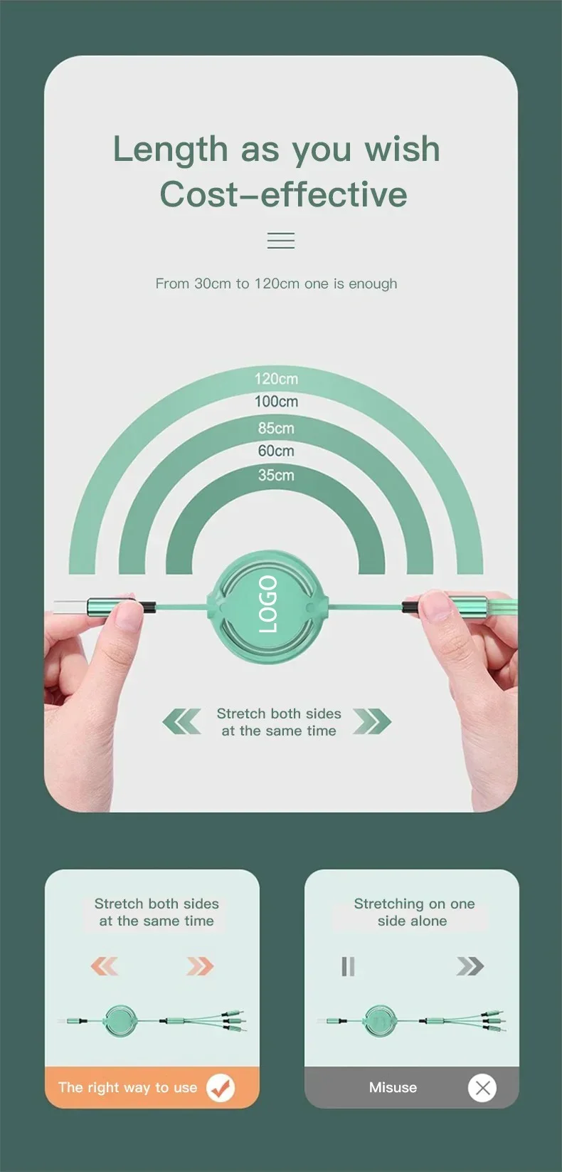 Poids : 50 g Le paquet comprend : 1 pièce Matériau : ABS Type : Type-C+Apple+Android Couleur : Noir/Rose/Rouge/Jaune/Violet/Vert menthe Caractéristiques : 1,3 A charge rapide, stable et compatible. 2. Réunion à 99% des besoins des équipements quotidiens. 3. Conception télescopique à un glisser trois, pour étirer, anti-enroulement et trois extrémités peuvent être chargées rapidement en même temps. 4. Un câble de données est universel pour tous les téléphones mobiles, avec fonction de reconnaissance automatique pour une charge rapide et une charge flash.