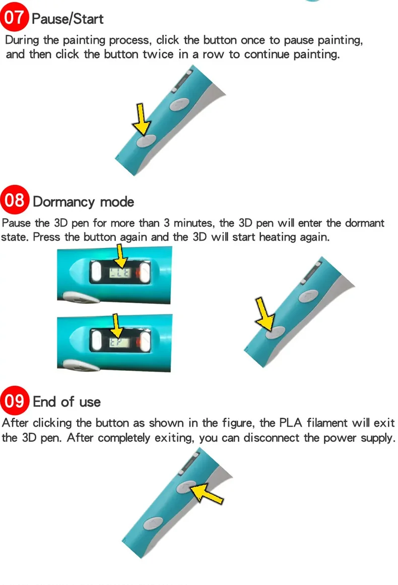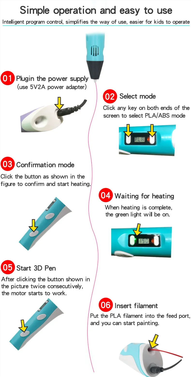 * Le stylo de deuxième génération peut utiliser des consommables ABS et PLA, mais le PLA est incolore, inodore, non toxique, sain et respectueux de l’environnement;