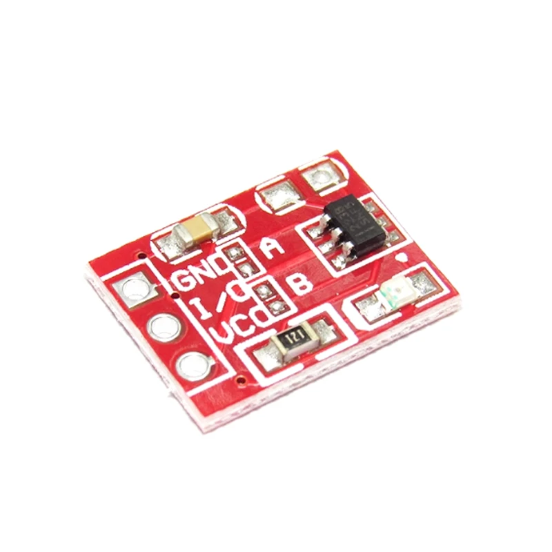 The module is based on a touch-sensing IC (TTP223B) capacitive touch switch module. In the normal state, the module output low, low power consumption; When a finger touches the corresponding position, the module output high, if not touched for 12 seconds, switch to low-power mode.