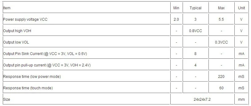 The module is based on a touch-sensing IC (TTP223B) capacitive touch switch module. In the normal state, the module output low, low power consumption; When a finger touches the corresponding position, the module output high, if not touched for 12 seconds, switch to low-power mode.