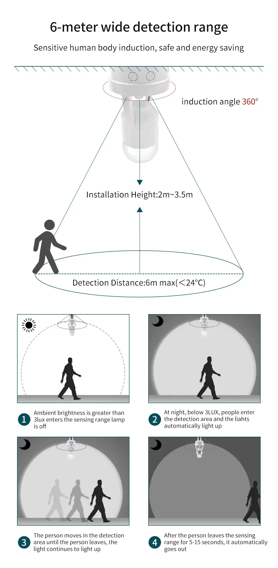 - Detection Distance: 6m max(<24°C)