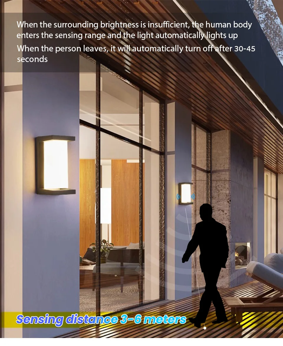 La plage de travail de la applique est de 3 à 6 mètres et elle fourniront l’éclairage continu lorsque les gens ou les objets se déplacer dans cette gamme.Quand une personne ou un objet feuille cette gamme, la applique sera éteinte après 30 à 45 secondes.