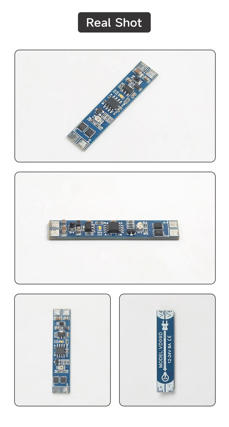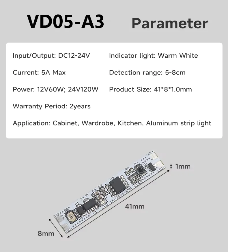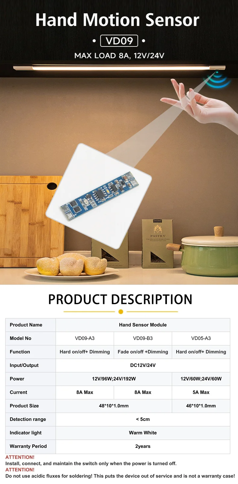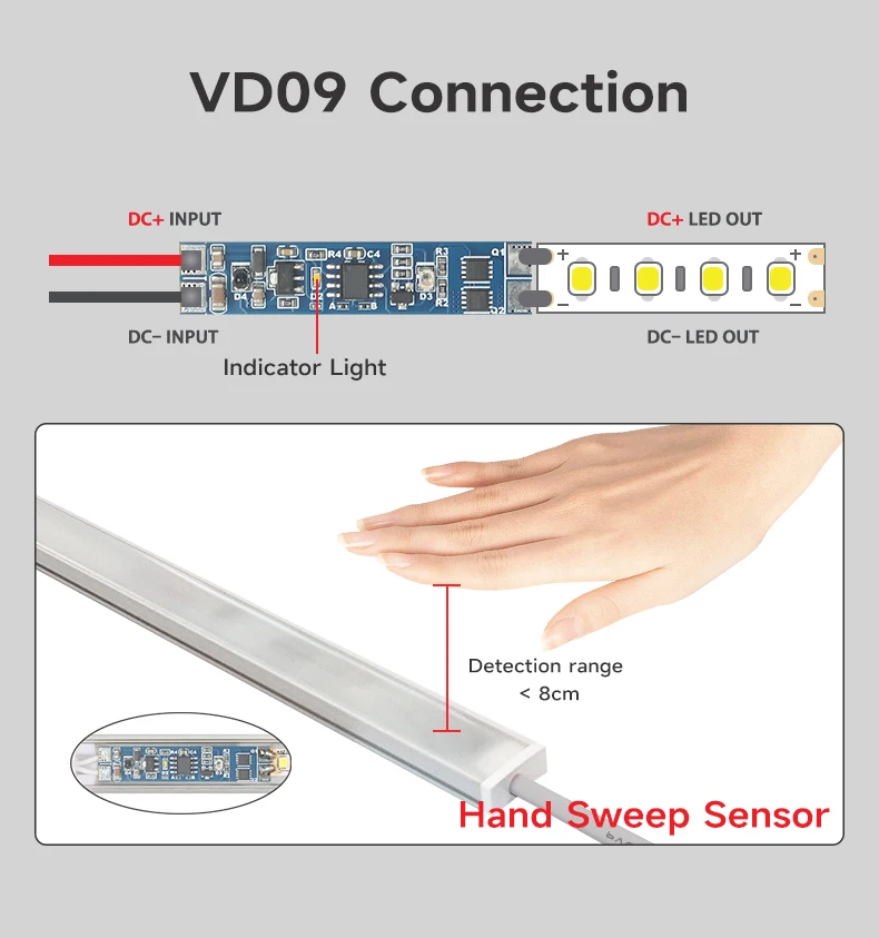 *Le capteur sans contact à balayage manuel de la série VD09 est conçu pour allumer/éteindre et atténuer les bandes LED 12/24 V installées dans un profilé en aluminium.L’appareil est contrôlé sans contact physique direct par le mouvement de la paume.L’écran s’effectue à l’aide d’une LED d’une température de couleur de 3000K à l’état éteint.