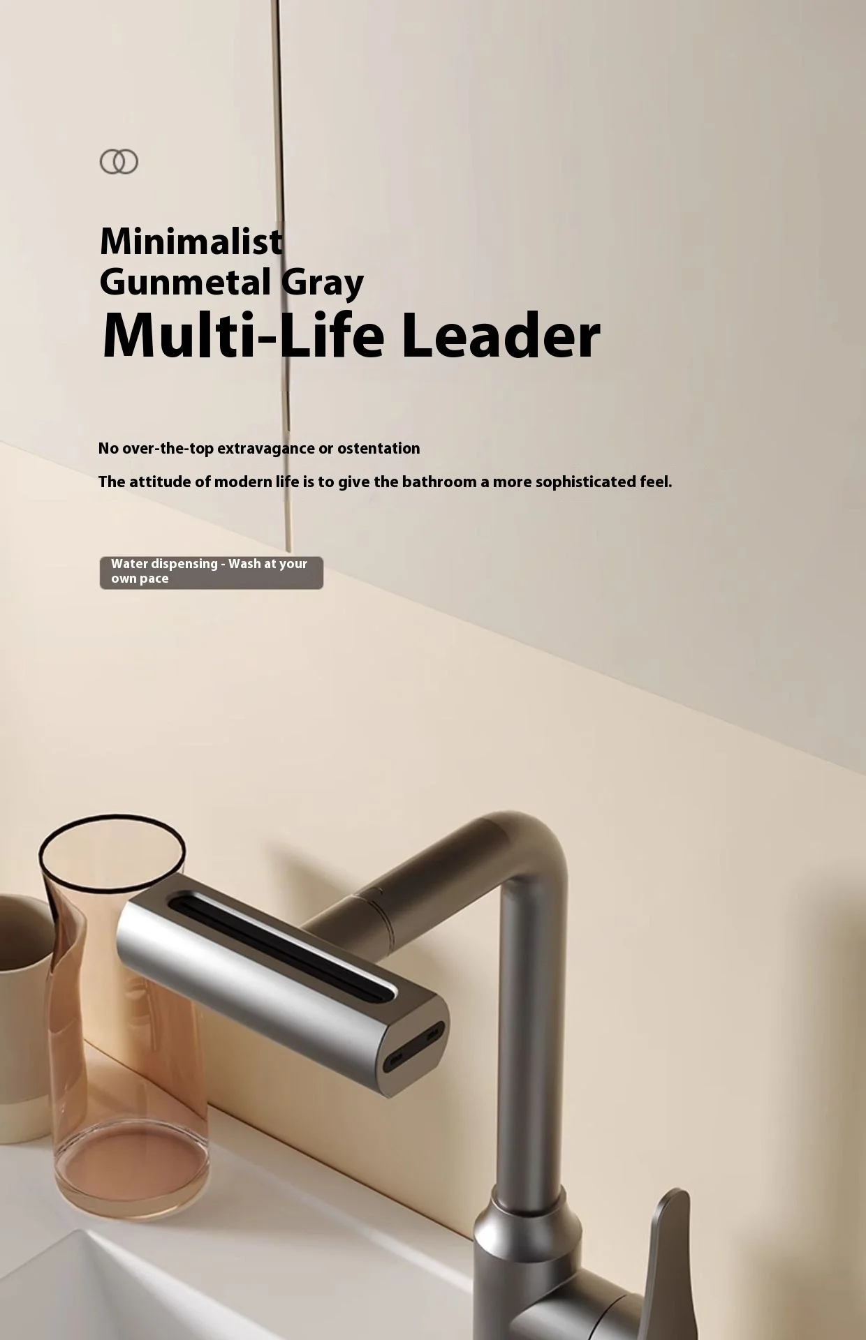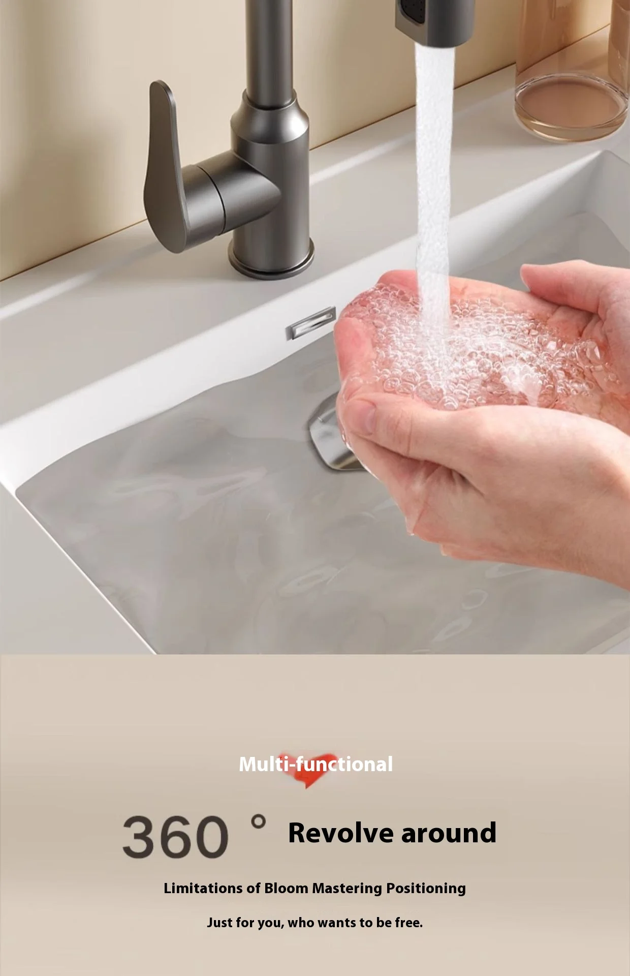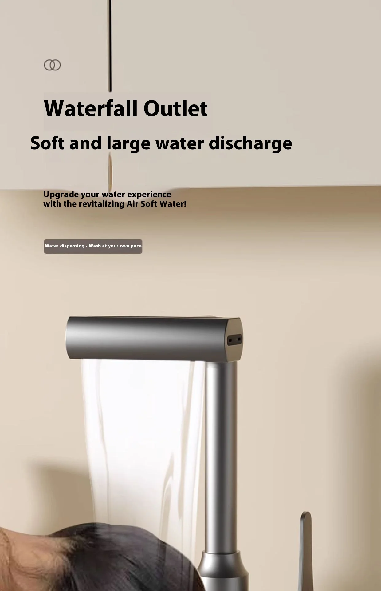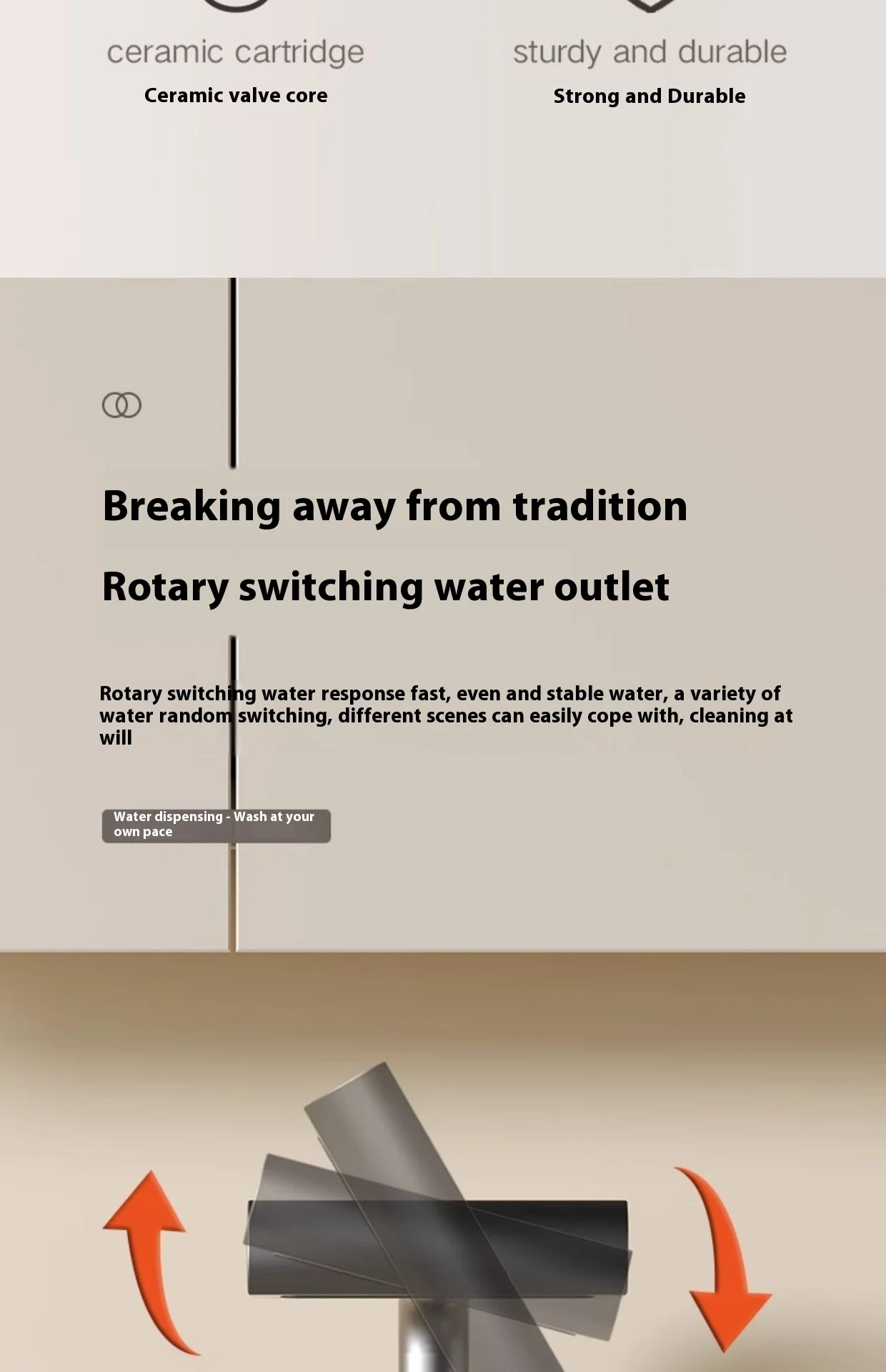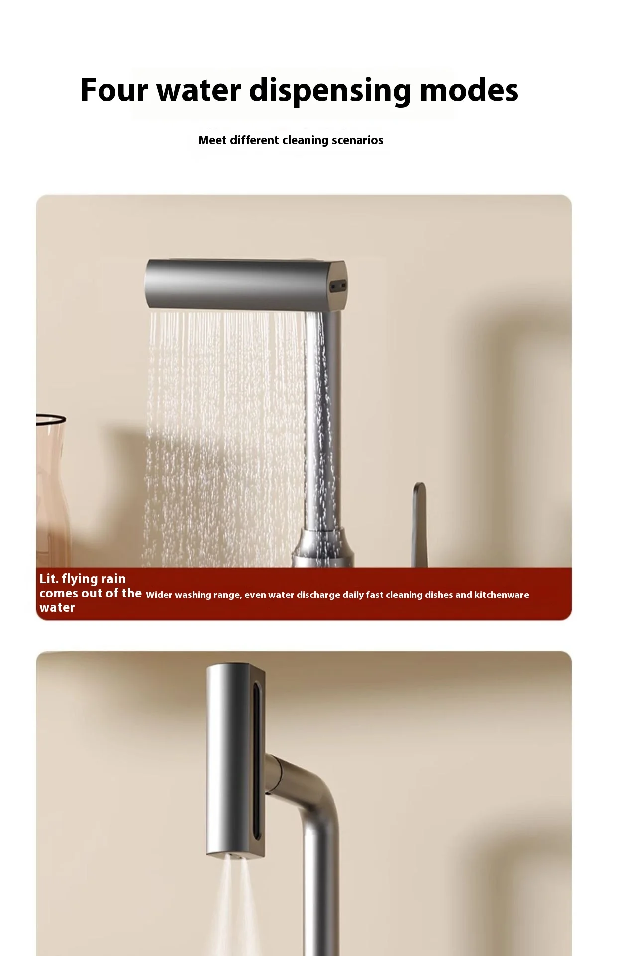 1.**Quatre modes d’eau** : le robinet offre quatre modes d’eau, dont une douche à effet pluie, une cascade, etc., pour répondre à divers besoins d’utilisation et vous offrir l’expérience de lavage ultime.
