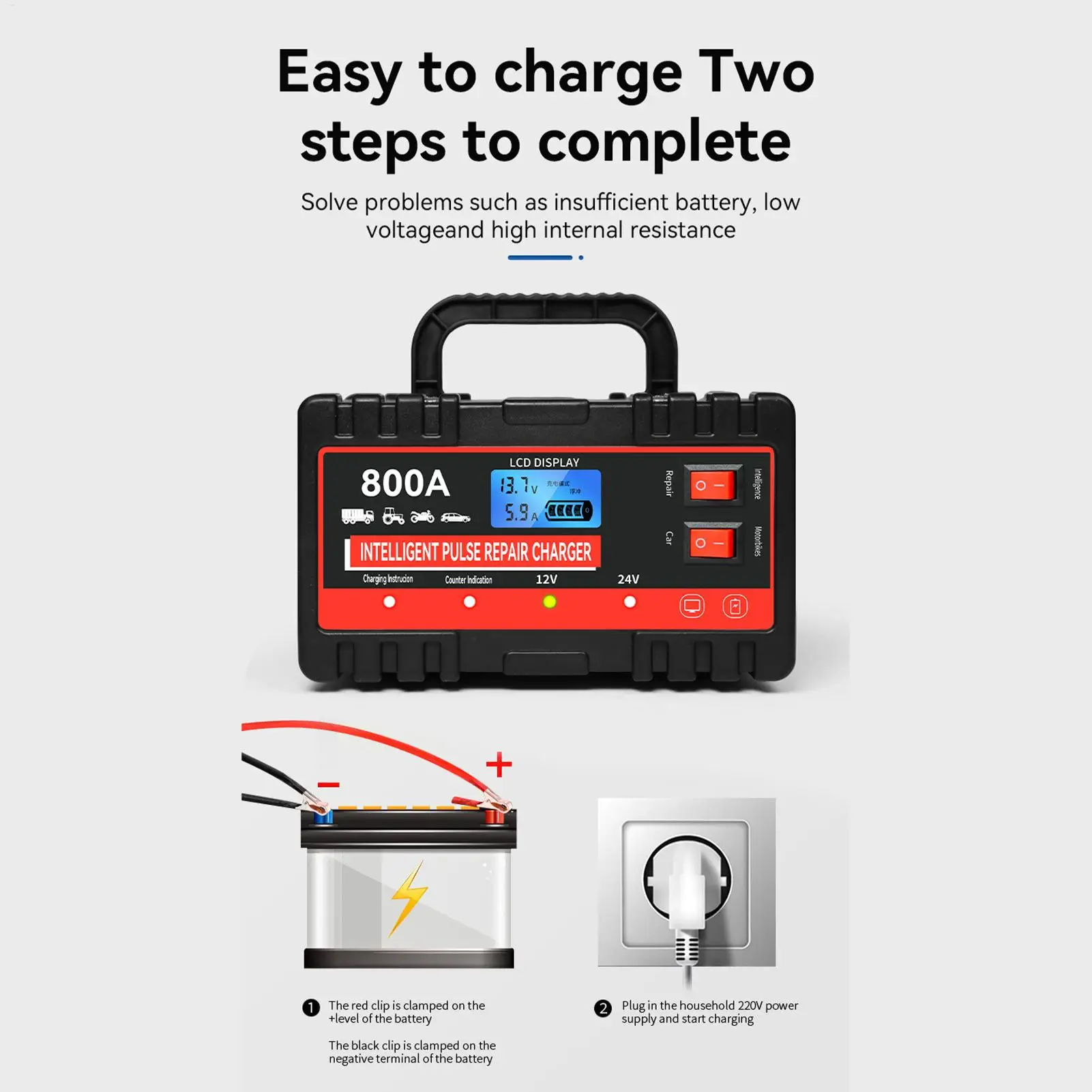1.Solution de charge facile : équipé d’une puce intelligente qui détecte l’état de la batterie et ajuste automatiquement les paramètres de charge pour des performances efficaces, sans intervention manuelle, garantissant un processus de démarrage/arrêt facile tout en éliminant le besoin d’une saisie constante de l’utilisateur.