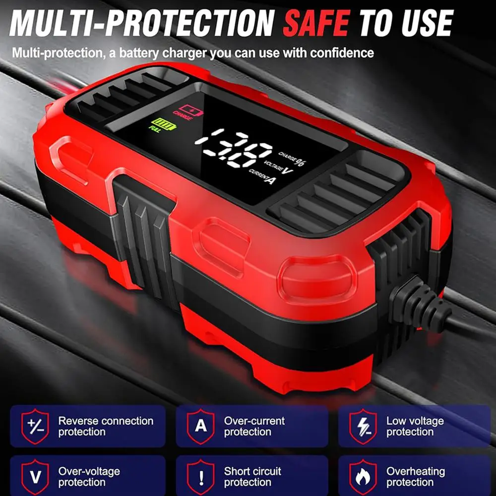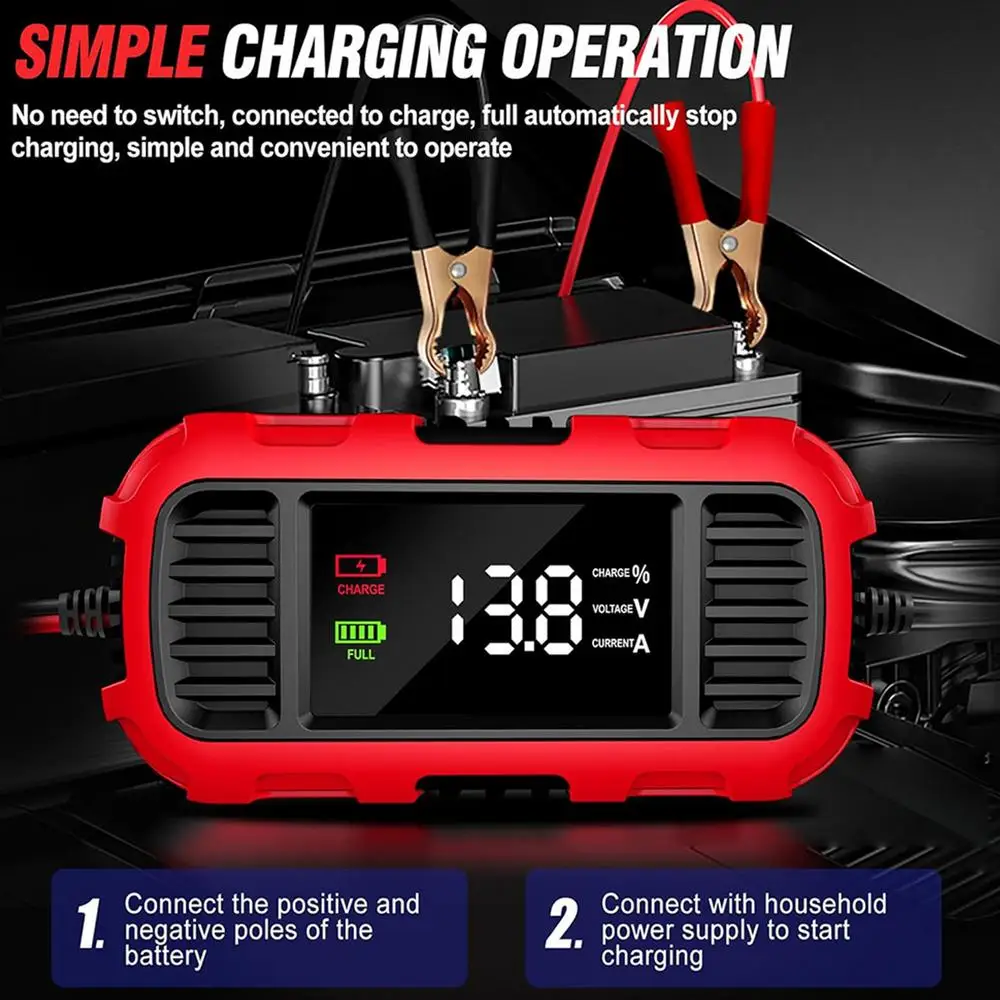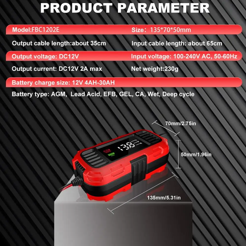1. Largement Applicable: il peut recharger et maintenir une large gamme de batteries au plomb 12 V, des batteries de motos et automobiles aux tondeuses à gazon et scooters, applicables dans une plage de capacité de 4AH-30AH