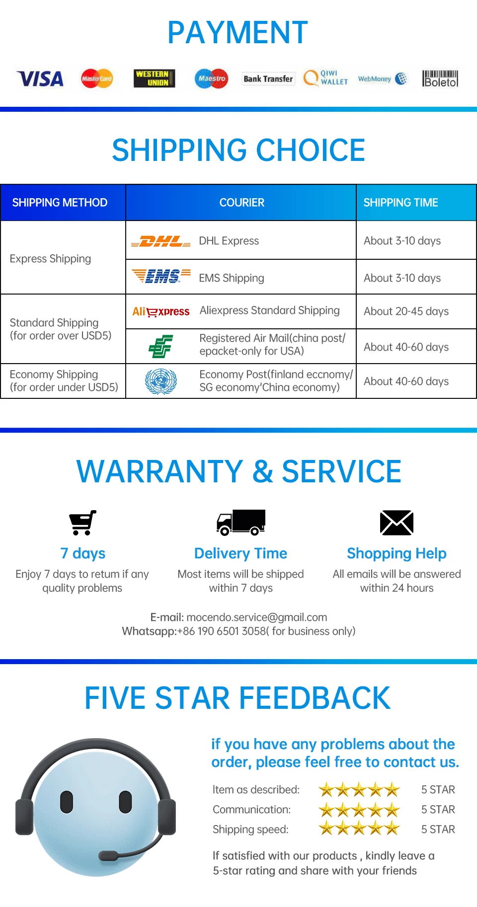 À propos de la livraison : après réception de votre commande, nous effectuerons une série de tests sur le produit dès que possible pour garantir que le produit ne présente aucun problème de qualité, puis l’emballerons et l’expédierons dans des boîtes d’emballage anti-collision pour garantir que le produit est livré en toute sécurité.Veuillez attendre patiemment.